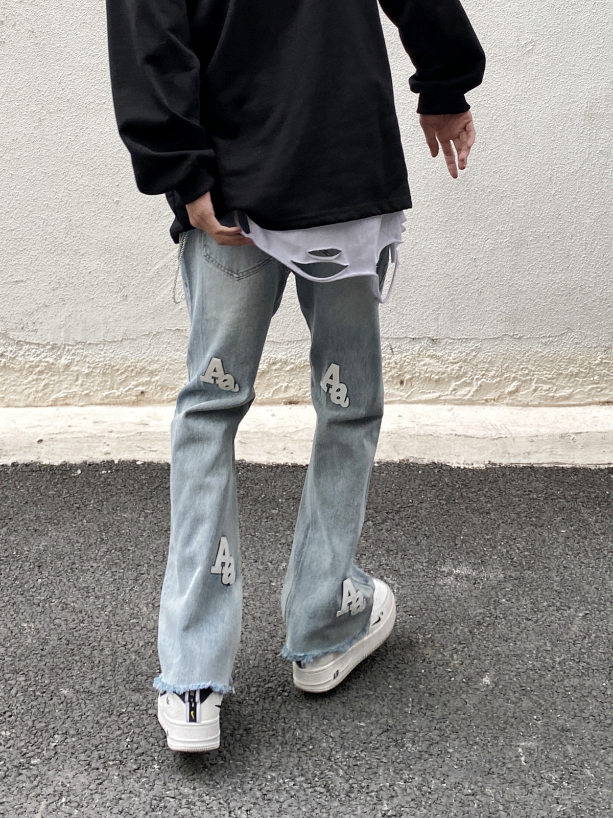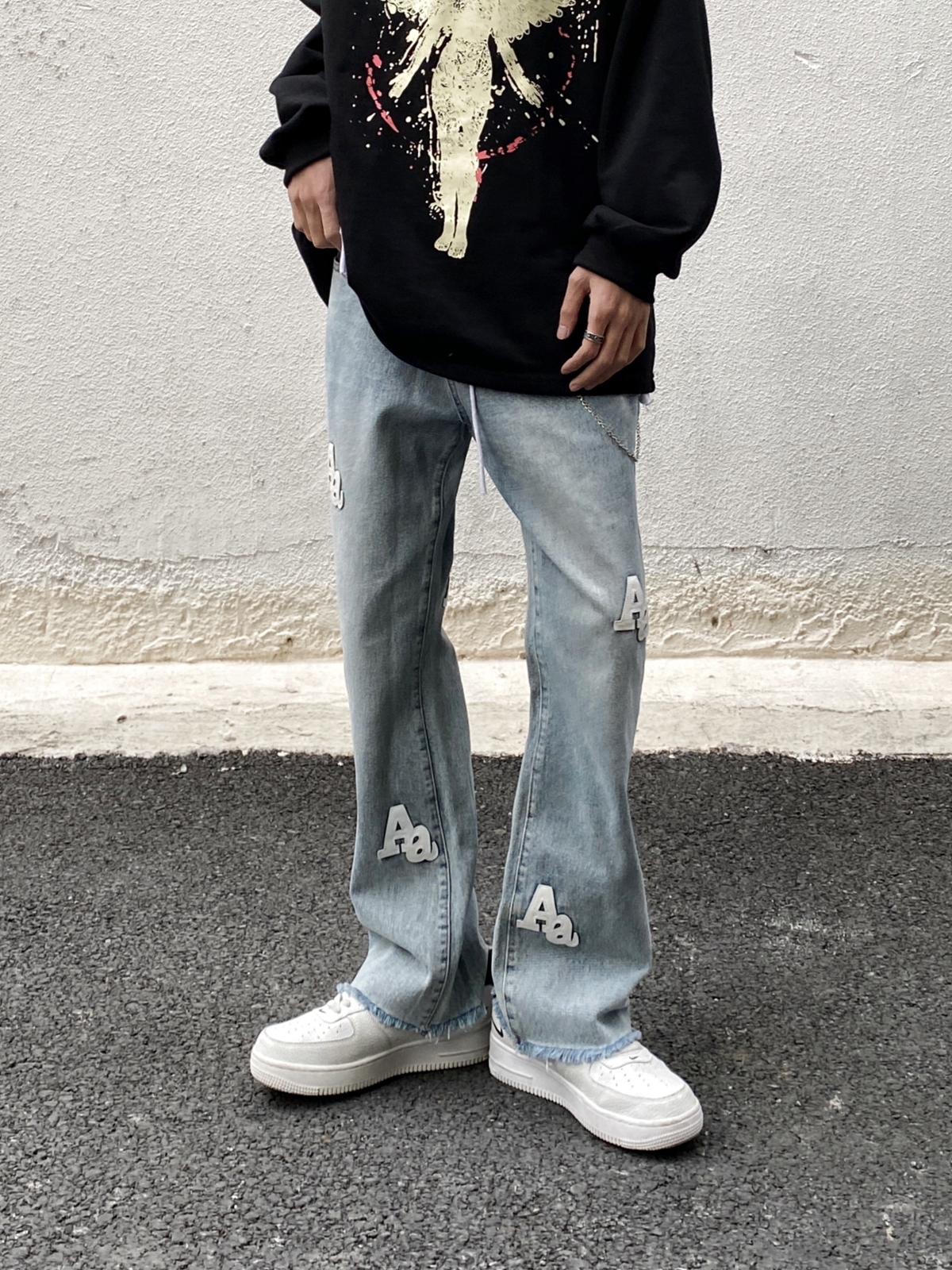这款牛仔裤采用水洗蓝色的面料,裤身上有着磨破设计,搭配炫酷的字母印花,带你大玩高街风,合体的版型简约时尚,你可以卷起裤脚穿,很有味道。