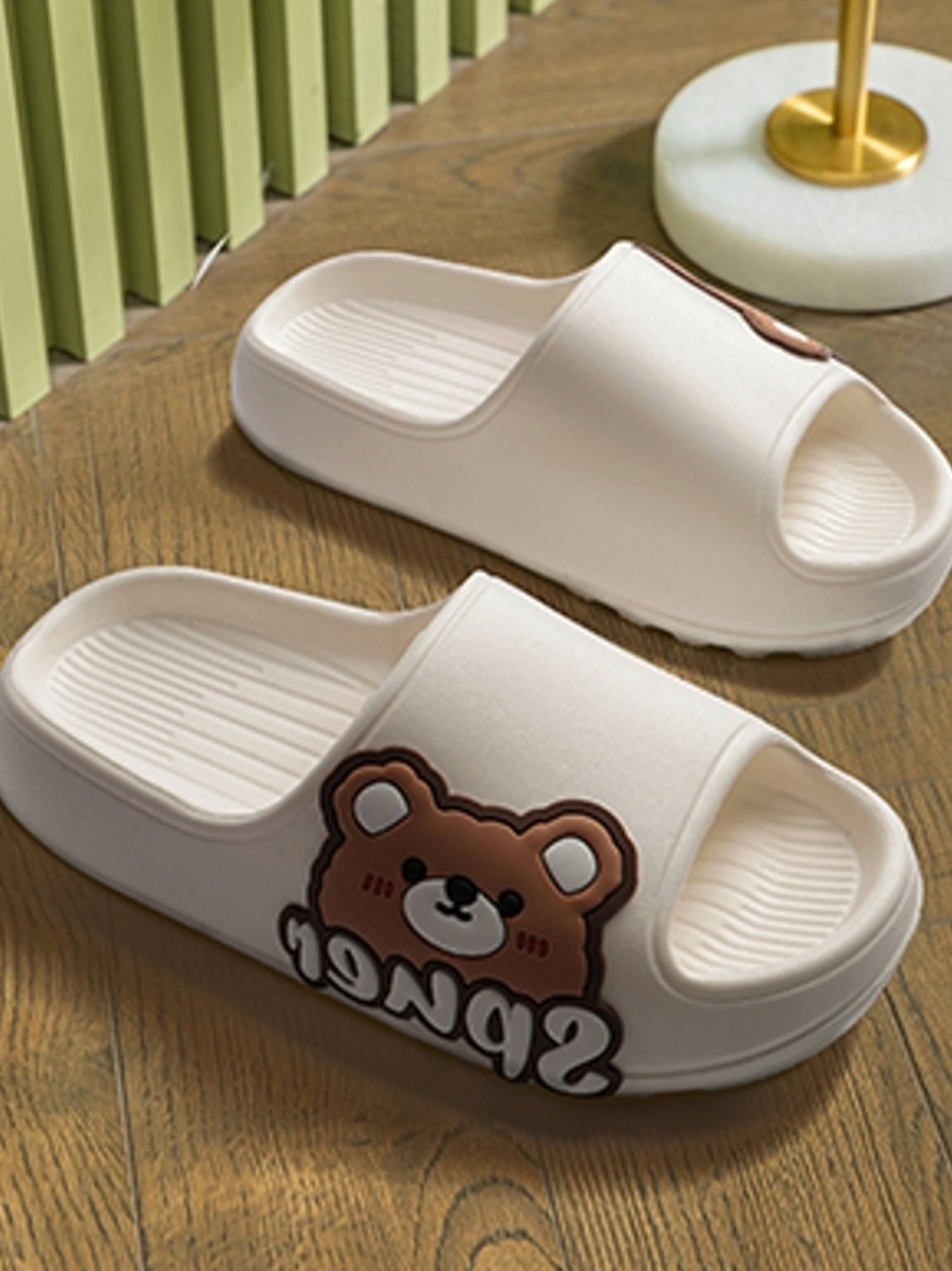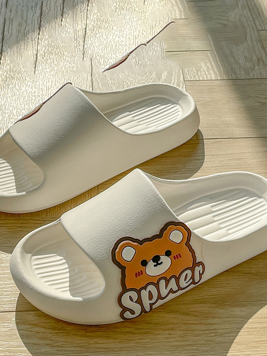 可爱又萌趣的一款凉拖鞋,米白色的色系,配以鞋帮处憨态可掬的卡通小熊和时尚的英文字母装饰,尽显满满的设计创意感。