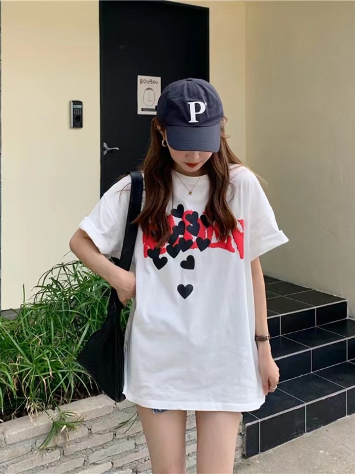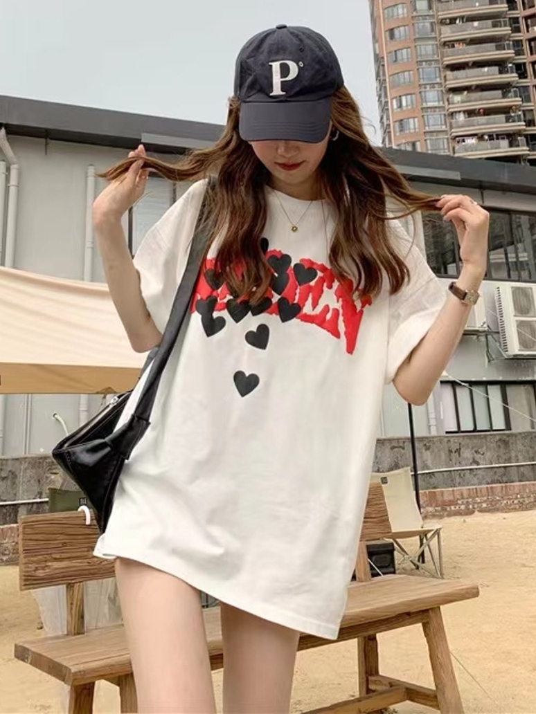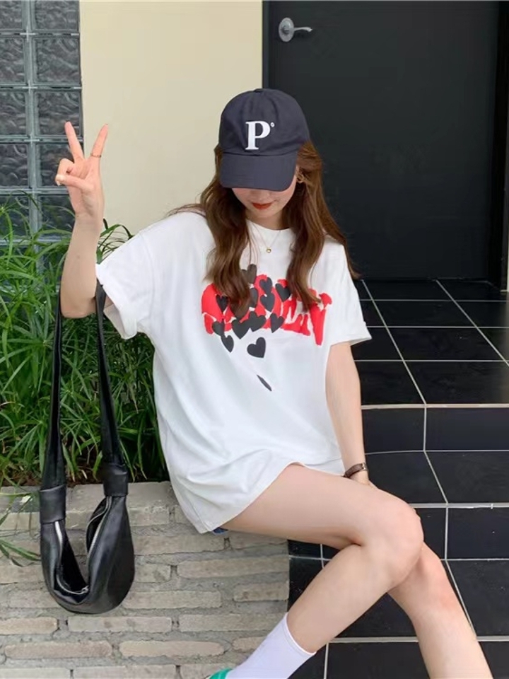 这款t恤是简约的风格,宽松的版型,时尚百搭,胸前的字母印花,很有个性,搭配牛仔裤或者短裤都很好看。