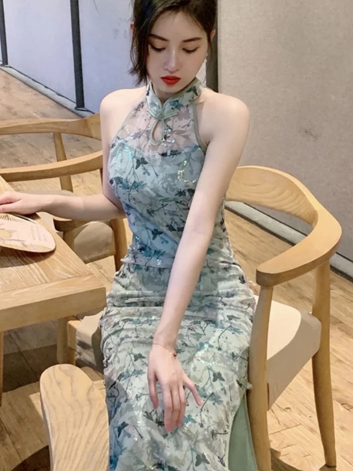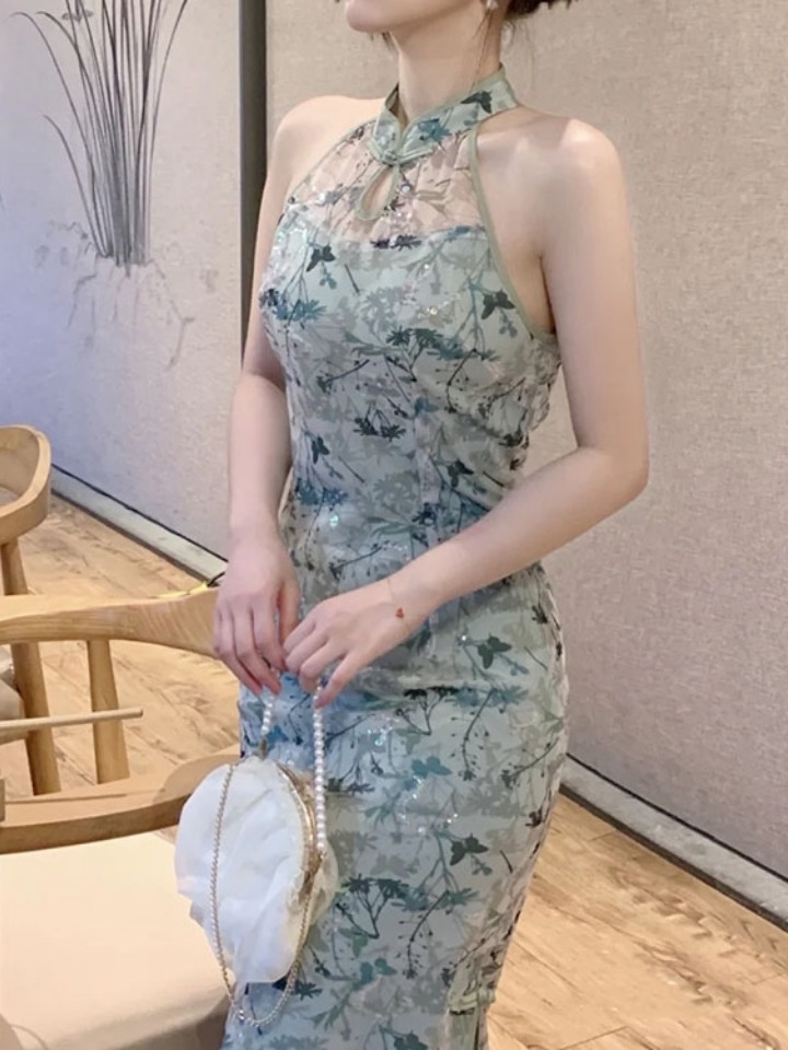 这款裙子最大的亮点在于旗袍式的连衣裙,精致的同时不失复古的美感,搭配清新的碎花装饰,整件衣服都散发出一种文艺的风情。