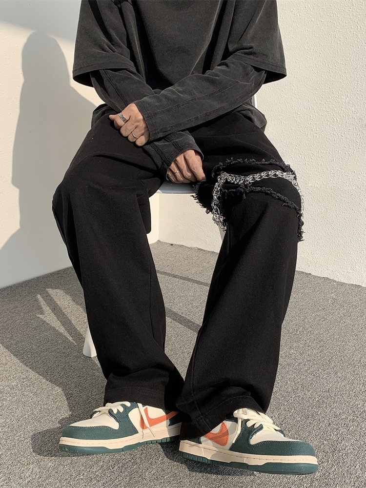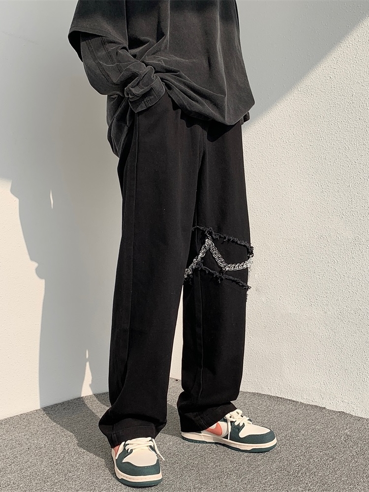 裤腿不对称的链子设计,巧妙添注时尚看点,个性加分,也让纯色系的裤身不显单调,增添整体的层次感。