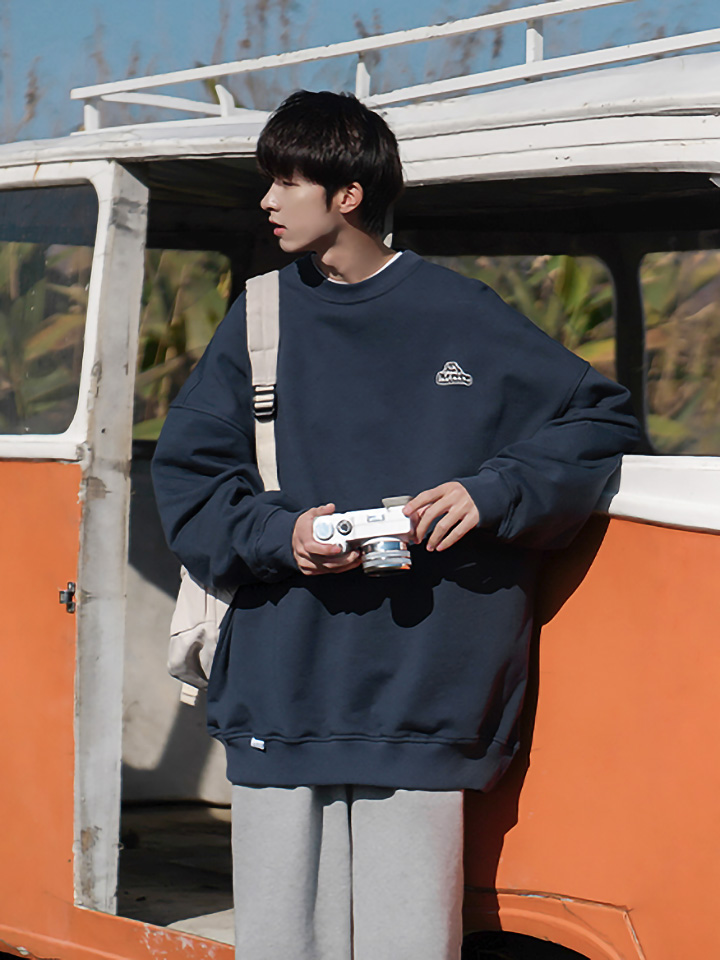 略宽松的卫衣版型,上身舒适,休闲感强, 落肩的设计,韩范儿十足,时尚百搭。简单的搭配一条休闲卫裤,运动休闲随时凹造型。