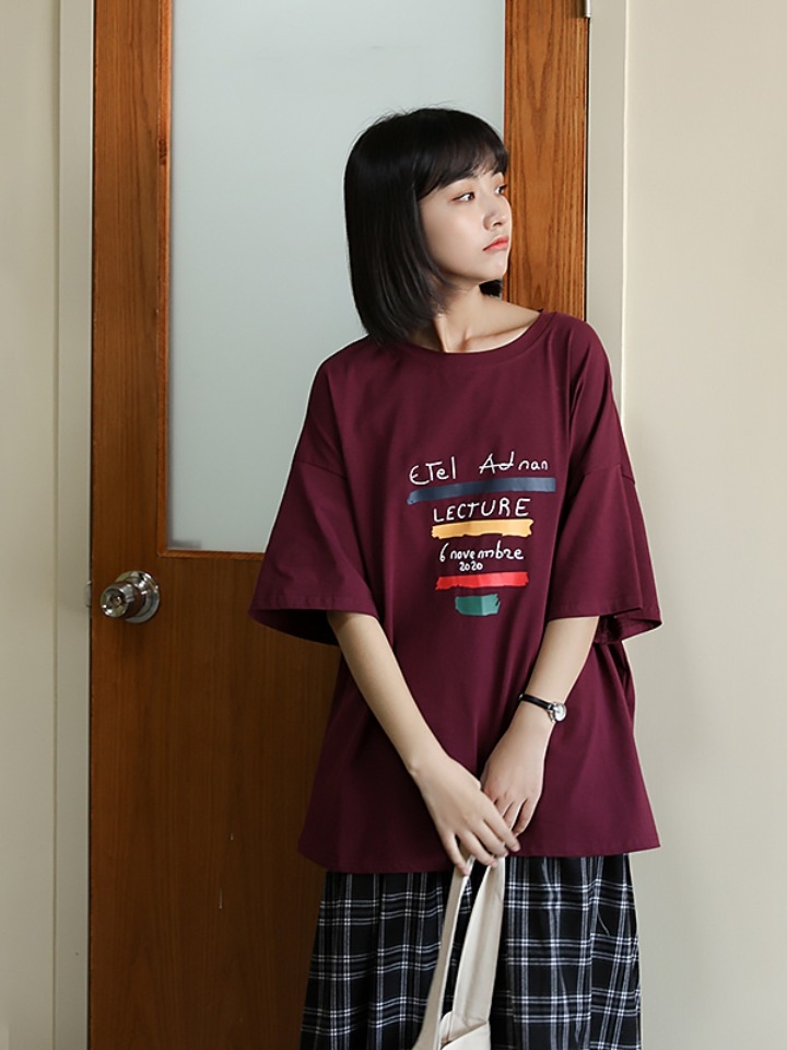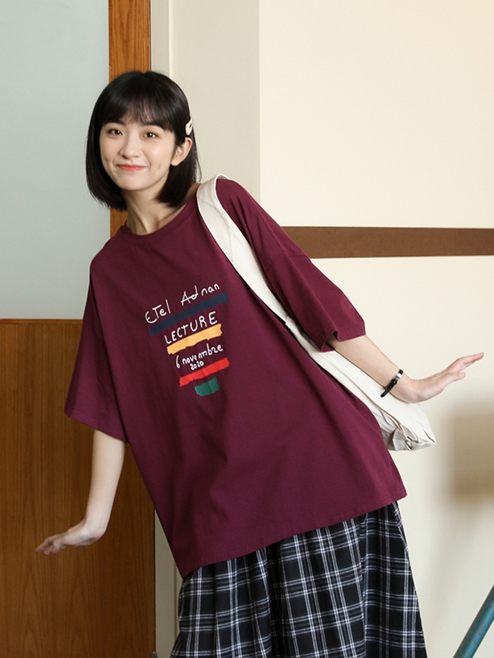 浓郁的日系休闲风,宽松的版型加入字母印花图案,给人随性休闲的时尚感,不追逐潮流。可以与格纹半身裙相配,轻松出行。