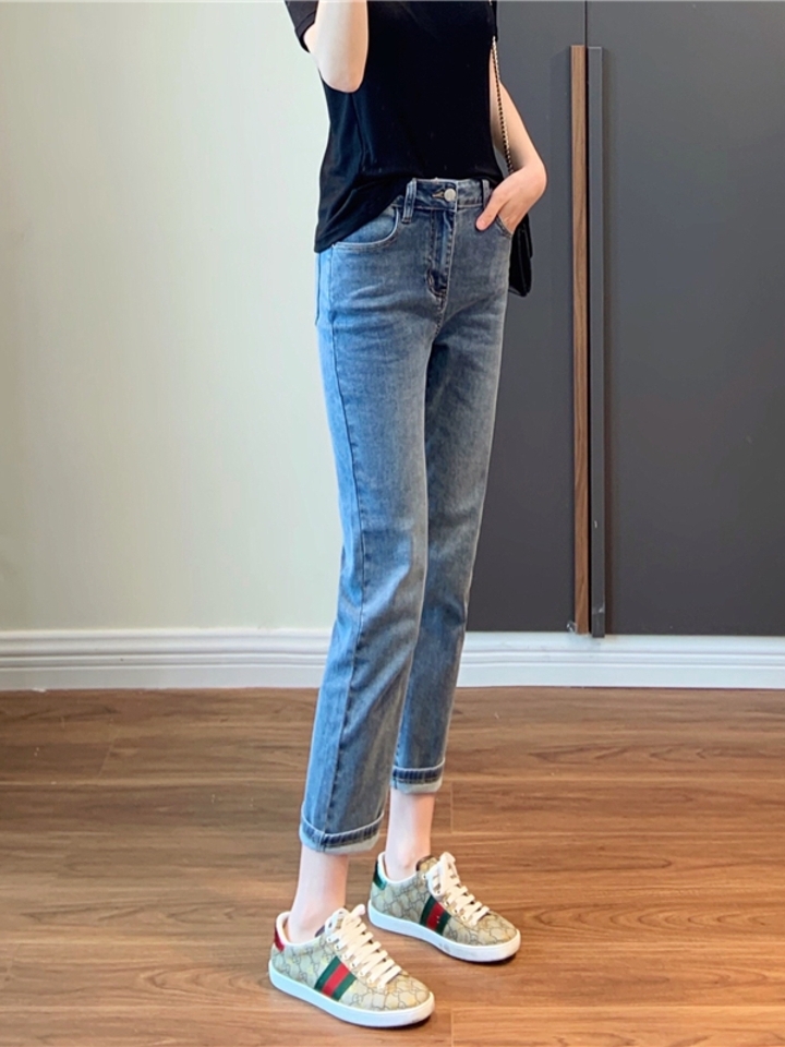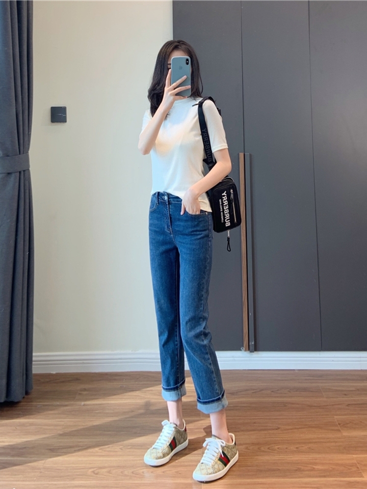 简约的纯棉牛仔布裤,弹性比较好,穿着柔软有韧度。版型是比较时髦耐看的,九分裤的设计,露出白皙脚踝,时髦显大气。卷裤口则更好看。