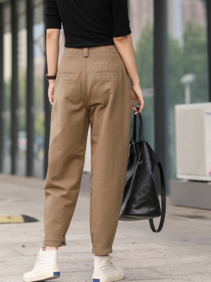 西裤同哈轮裤的混血,又是露踝式,简直完美啊。上宽下窄的哈伦廓,大PP小粗腿儿什么的统统掩藏。披着哈轮裤的外观,却保留了西裤的优雅干练
