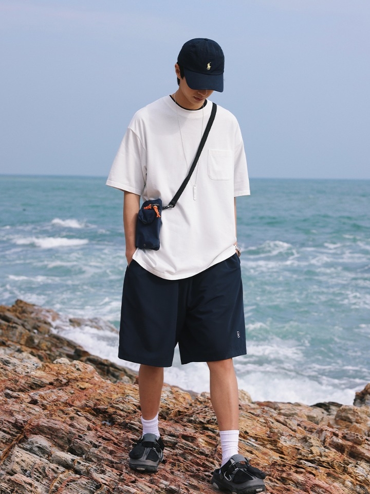 日系简约风T恤,在纯色衣身基础上;车线勾勒领口和袖口,低调耐看的线条勾勒版型;透气面料适合夏季穿搭,易于搭配。