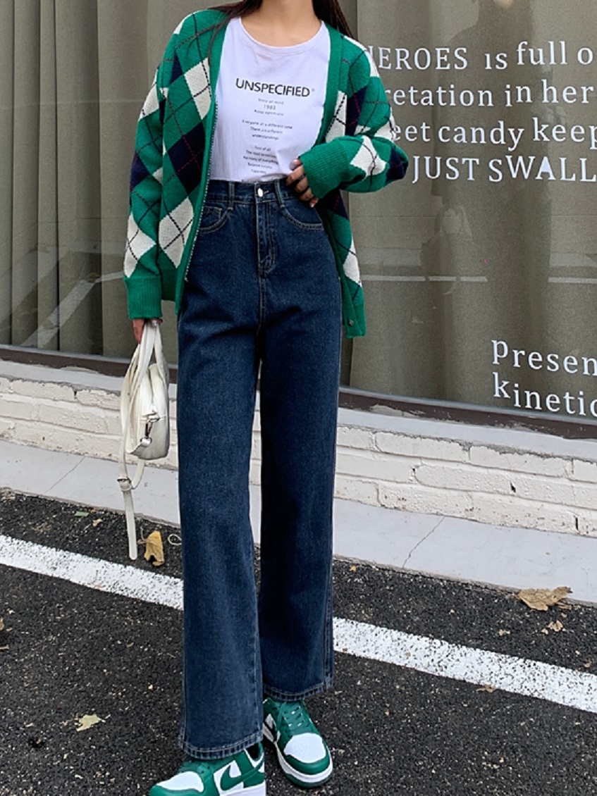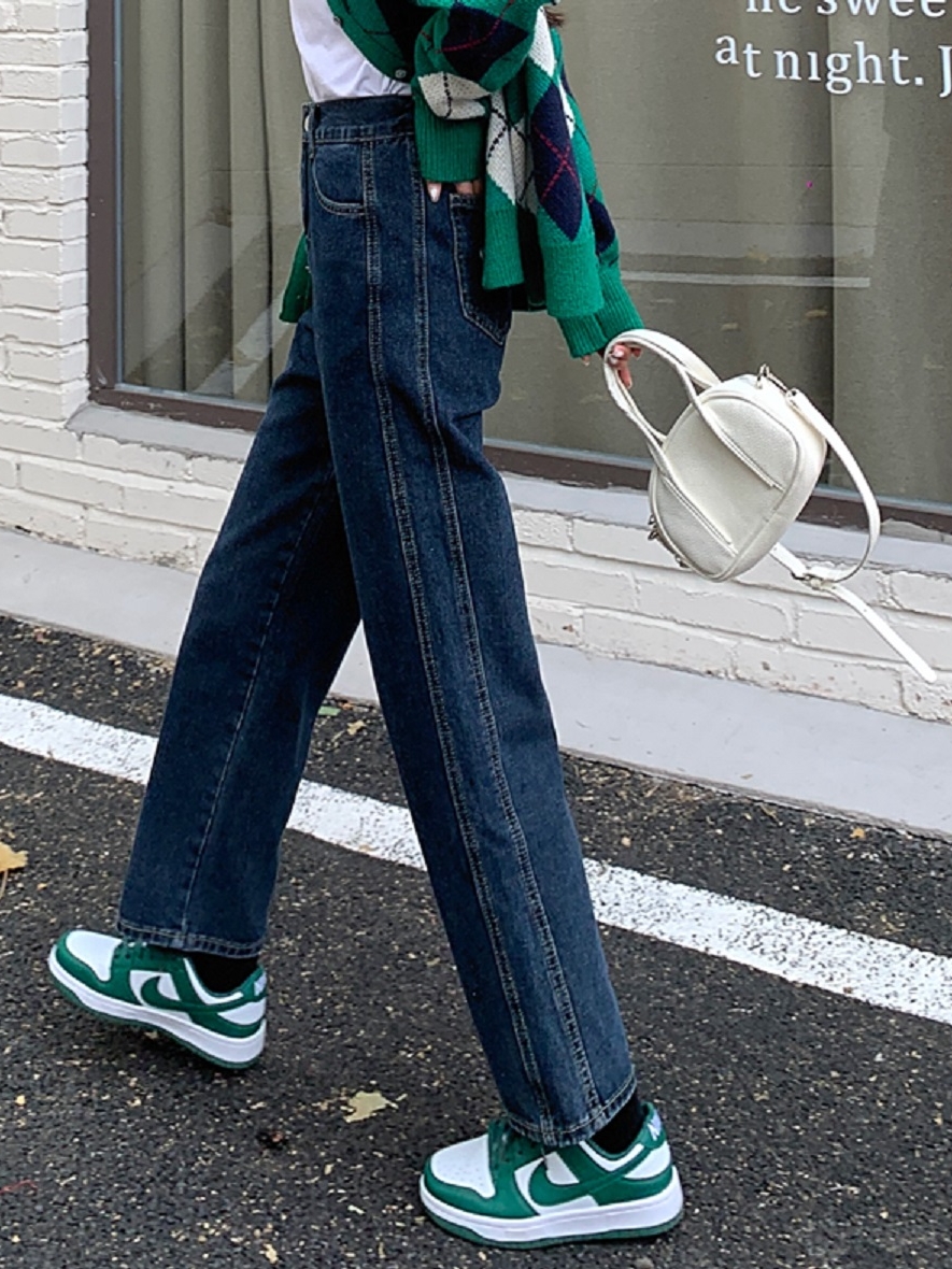 高腰设计,拉长身材比例。高腰牛仔裤,显瘦显腿长。直筒裤型,修饰腿部线条。