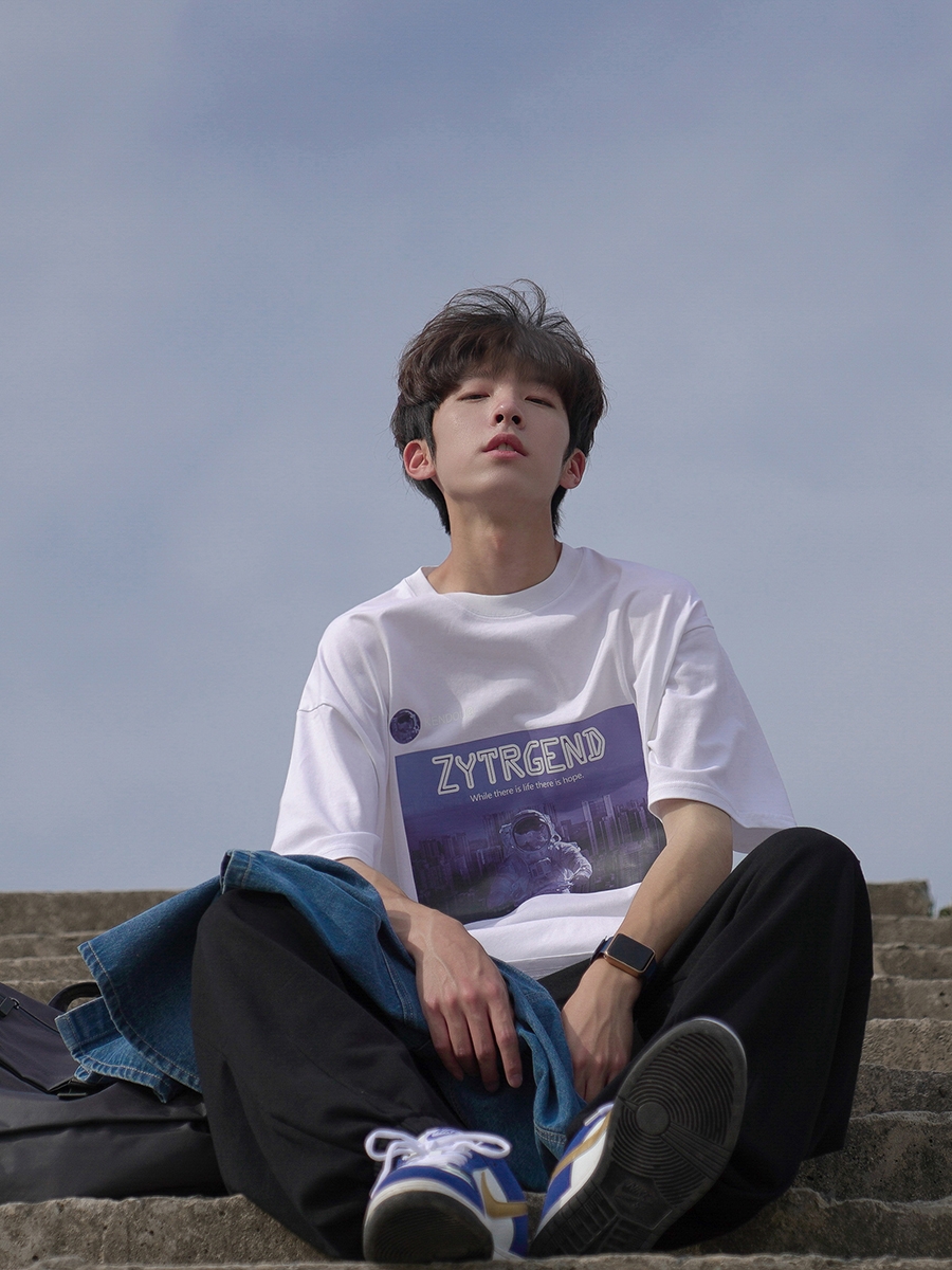 衣身的印花大气精致,色调简单,浩瀚的星空和宇航员的元素,彰显了浓浓的个性与时尚。圆领与胸前的印花相呼应,整体足够简单,也足够时尚。