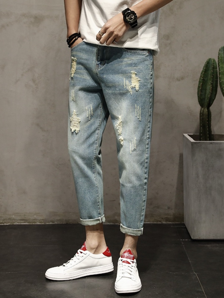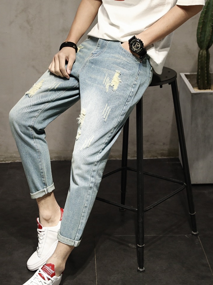 九分的长度设计露出脚踝,展示高挑的比例。随性的磨破设计彰显自由不羁的休闲态度,弹力牛仔面料亲肤舒适,适应各种身材。