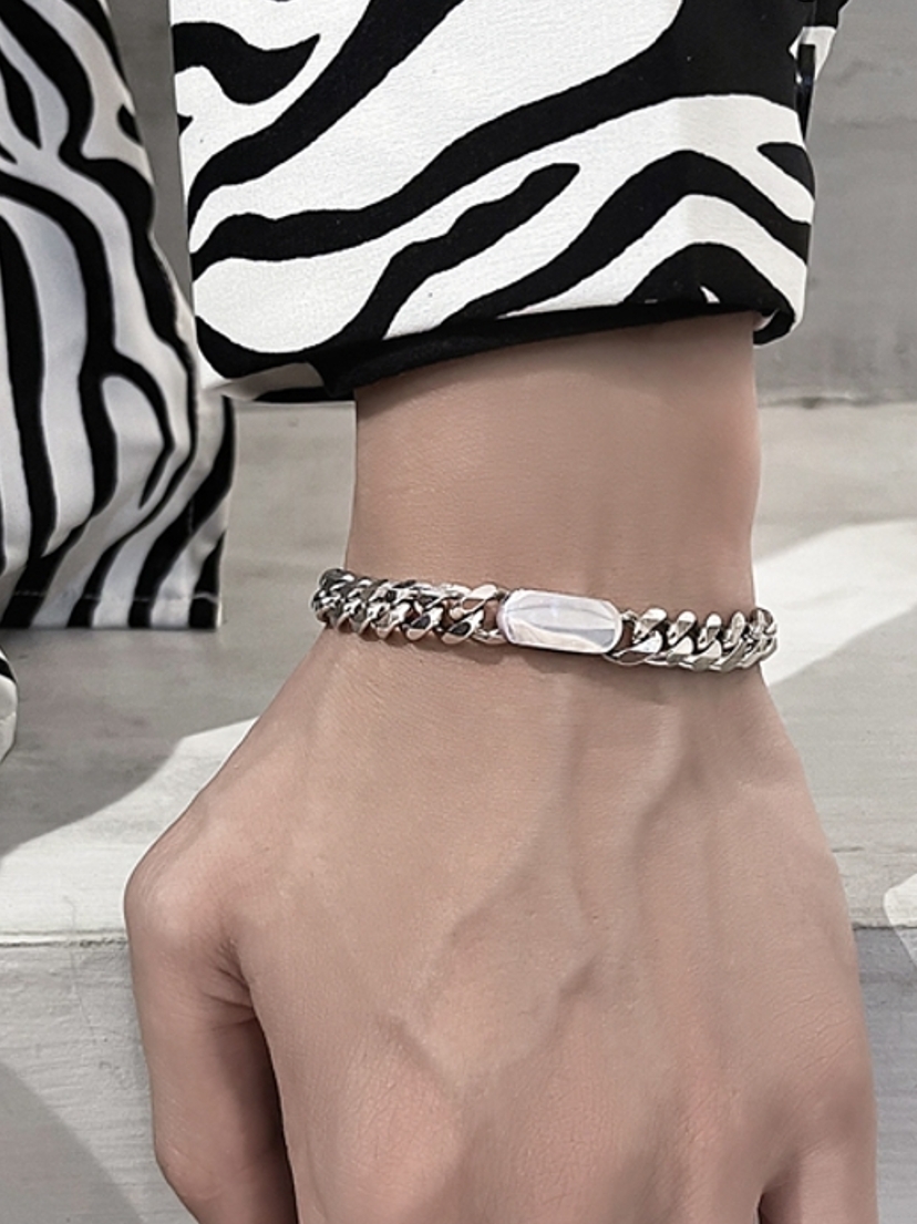 如大男孩般活力四射,戴在手腕上手感舒适,触感厚重。精美的玛瑙嵌入,为手链加分。灵活简单的DIY牛皮线孔设计,方便调节,满足各种手寸的需要。