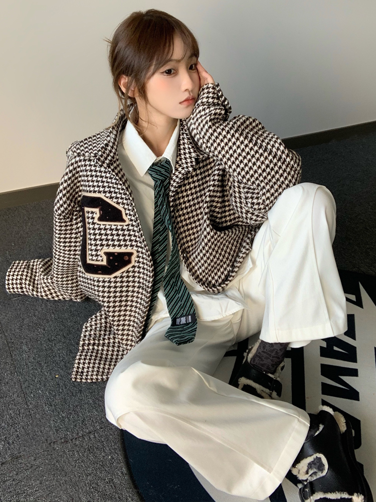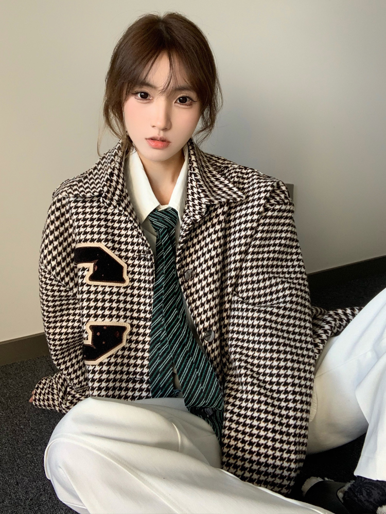 千鸟格图案既不显烦杂又给单品增加了很多精致感和设计感,时髦有范儿,宽松版型的设计遮肉又显瘦。