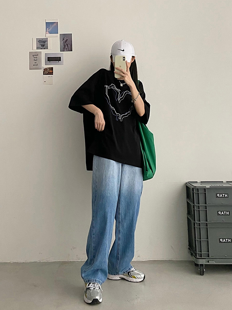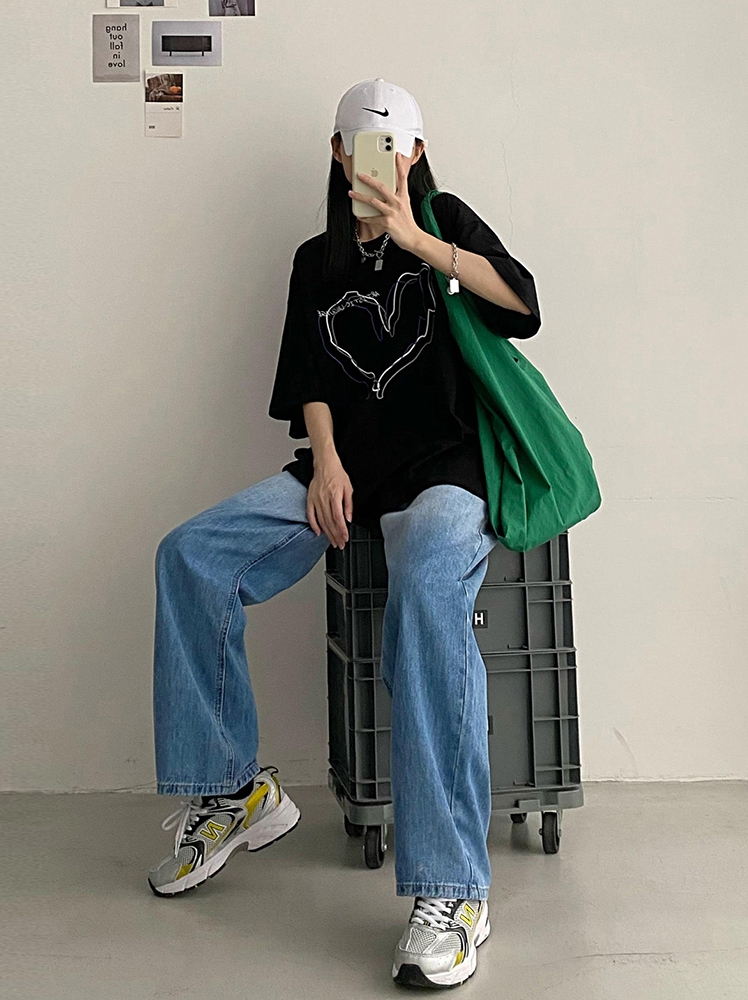 T恤是最经典的单品,几乎每人必备,宽松的短款版型,显瘦又百搭,时尚经典的爱心图案是经久不衰的潮流,明快大气,增加衣服亮点。