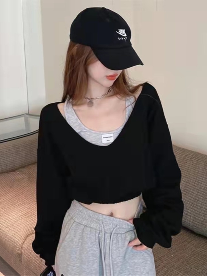 纯欲风的一款卫衣,假两件拼接的设计,凸显层次美感,穿着潮流时尚,还能让你摇身一变性感辣妹哦。