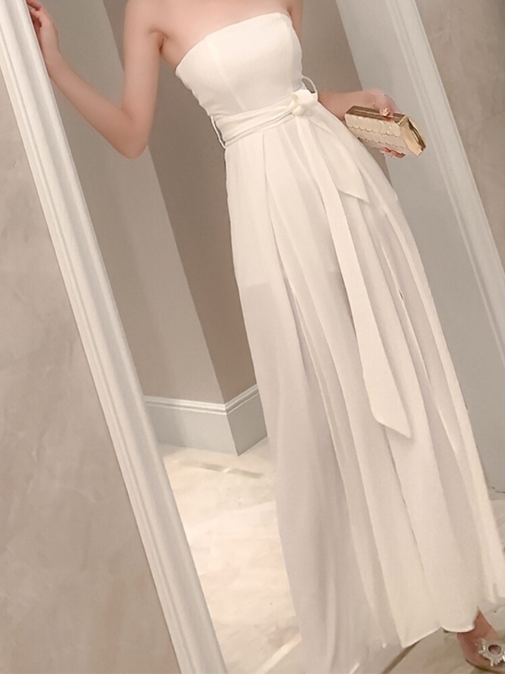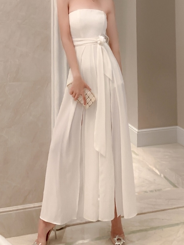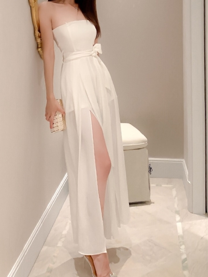 抹胸式的裙装穿着十分性感,拉伸了颈部的同时显得锁骨更加精致,网纱的面料加以钩花纹理,有种隐约感,恰到好处的收腰展现腰部纤细,而钉珠点缀别致有型,过膝设计的裙摆长度刚刚好。