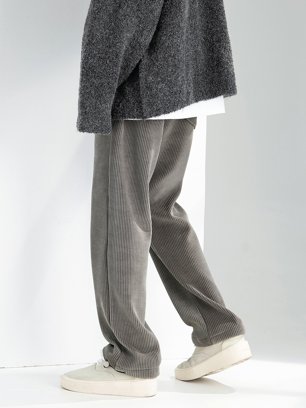 一款日系复古的长裤,选用优质棉纺灯芯绒面料制作,穿着舒适防风,经过水洗工艺加固着色,裤腰和裤脚均采用人性化松紧设计,方便穿脱,宽松的哈伦裤型上身显瘦无束缚感,衣身以帅气铁灰色为主色,在口袋上衣白色布片拼接,个性十足。