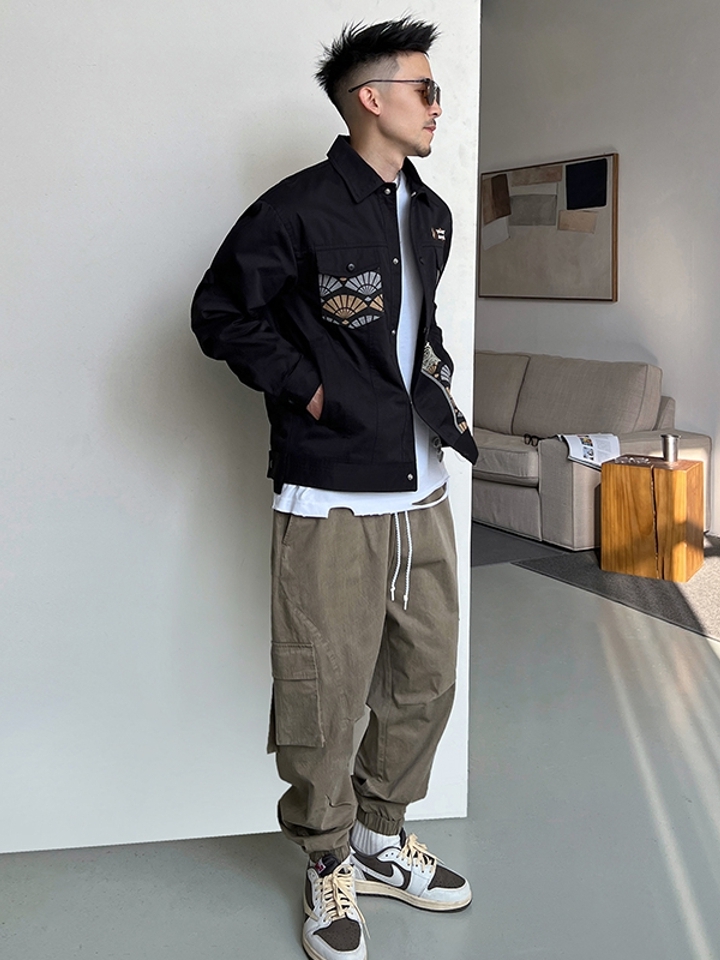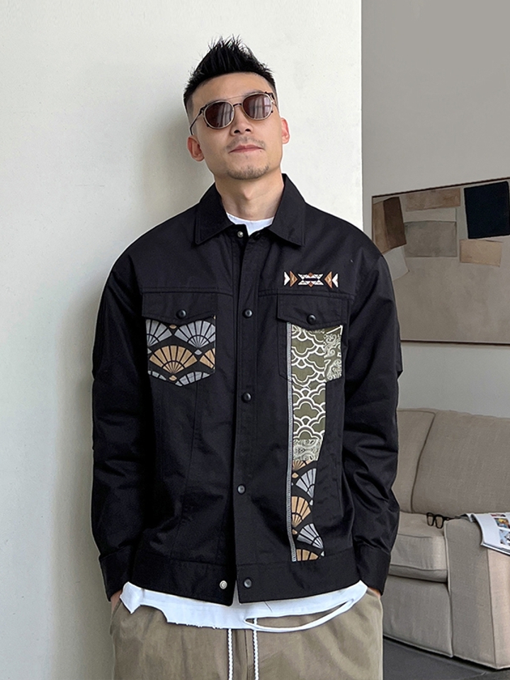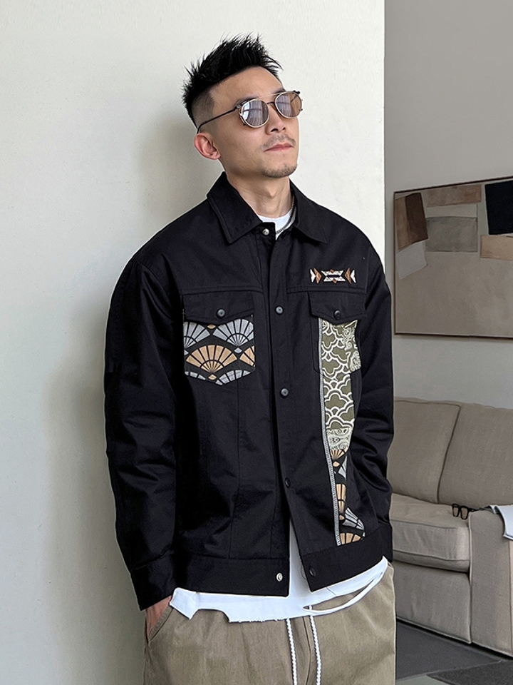 这个拼接黑色外套,属于很基础的版型,整个配色就很沉稳大方,胸前的印花就增加了整体亮点~多口袋设计,hin实用的。