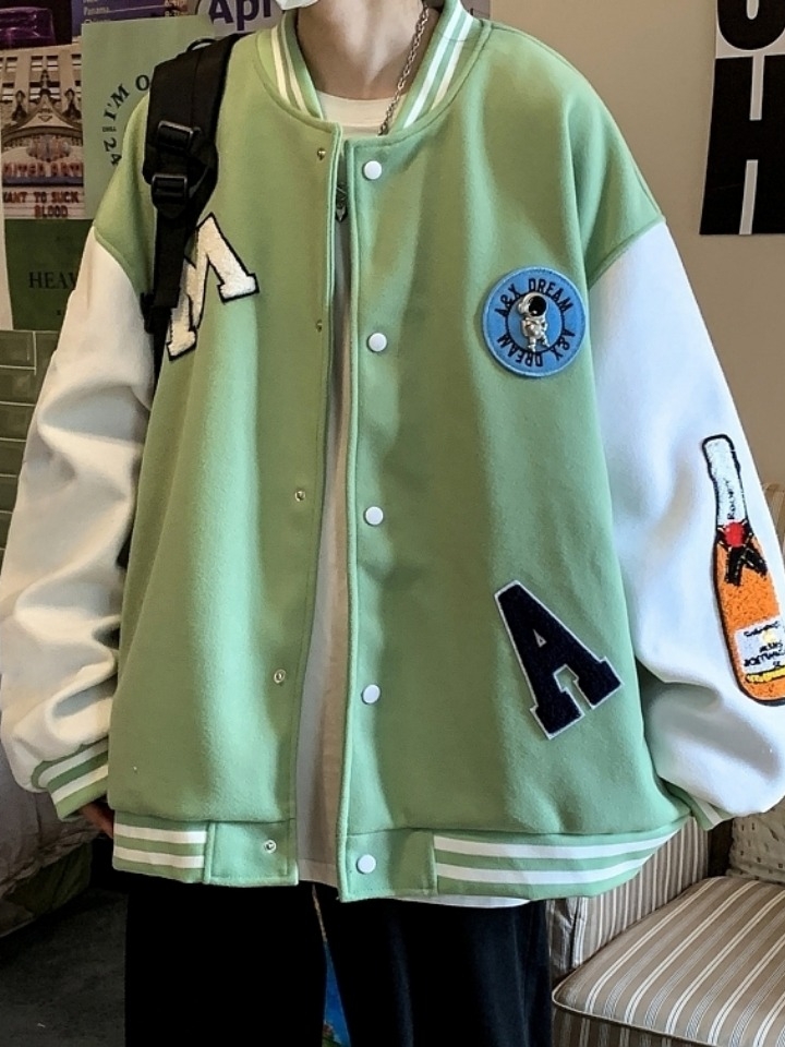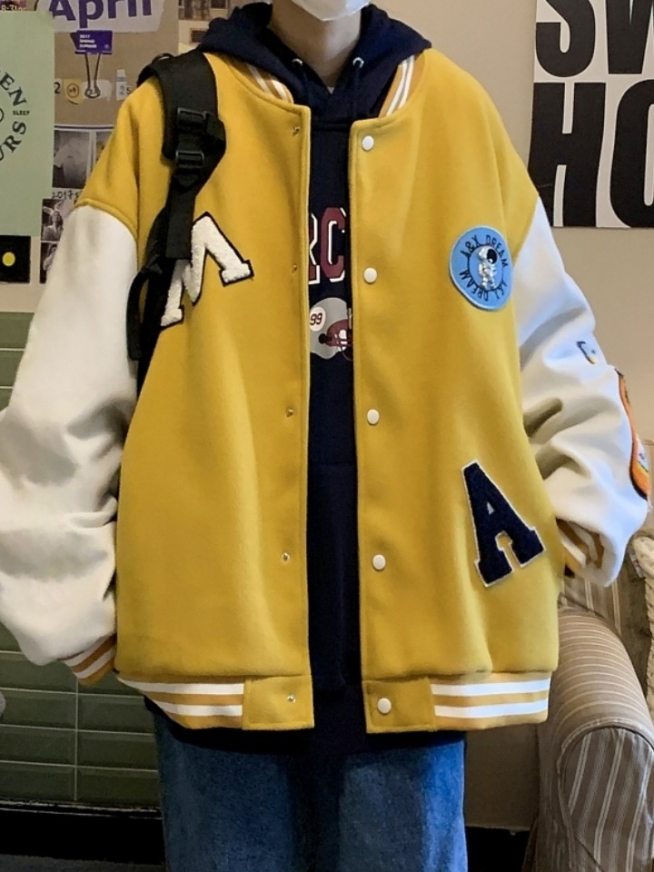 欧美风十足,棒球服的款式,更具朝气,宽松的版型,落肩袖设计,穿着舒适不束缚,衣身的印花,更具特色。