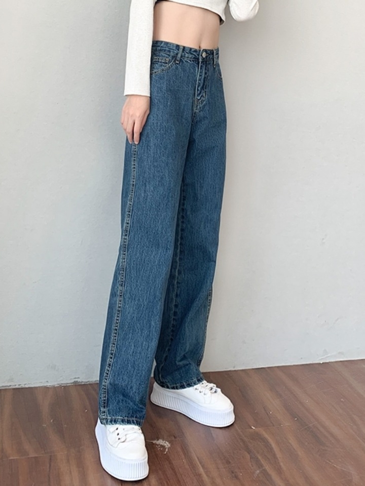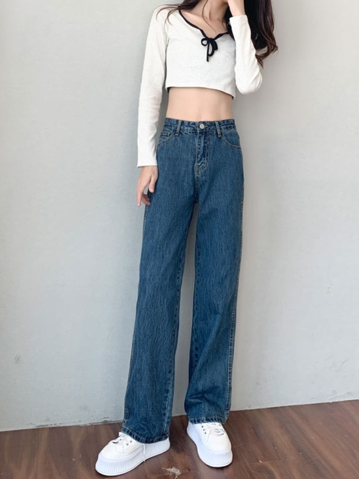 高腰的设计提升整体腰线,让大长腿立显出来,洗水感的设计也颇有一番风味,阔腿的裤脚有好的遮肉效果,显瘦显高挑不在话下,KO各种腿型。