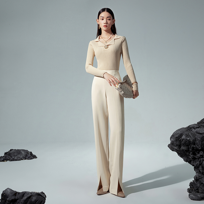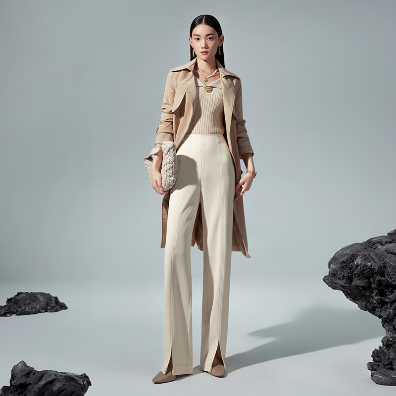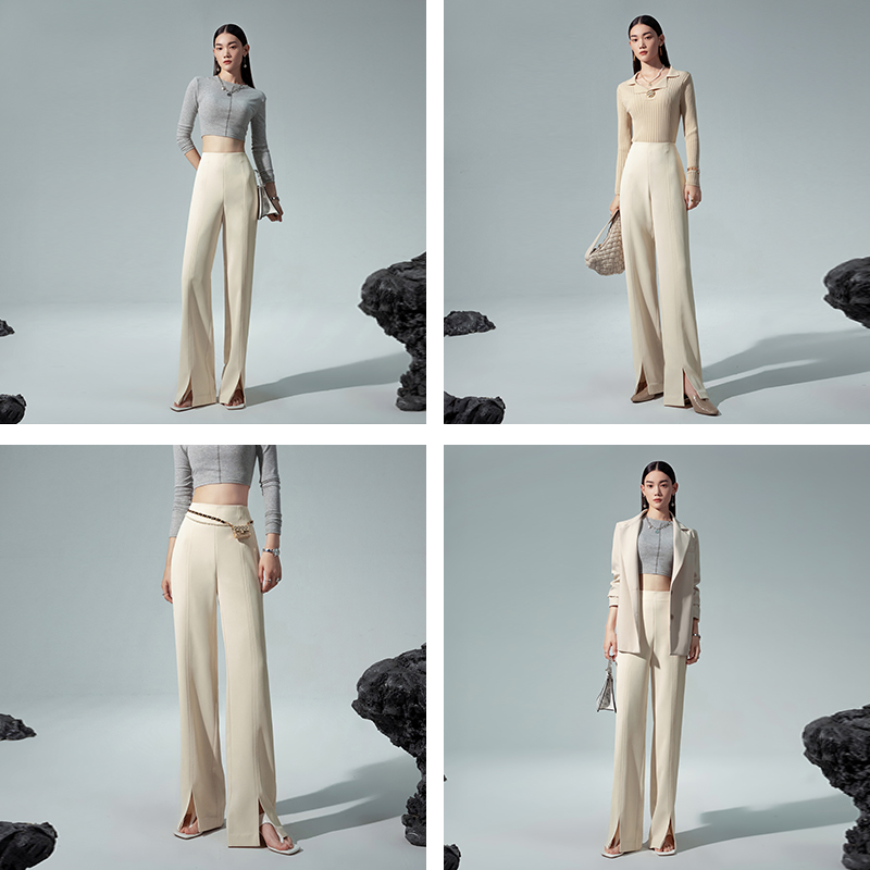 高腰的设计,拉长腿部线条,显瘦效果很好,高腰的版型,很显高挑,修身的剪裁,修饰腿部曲线,上身很有范。
