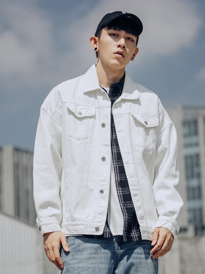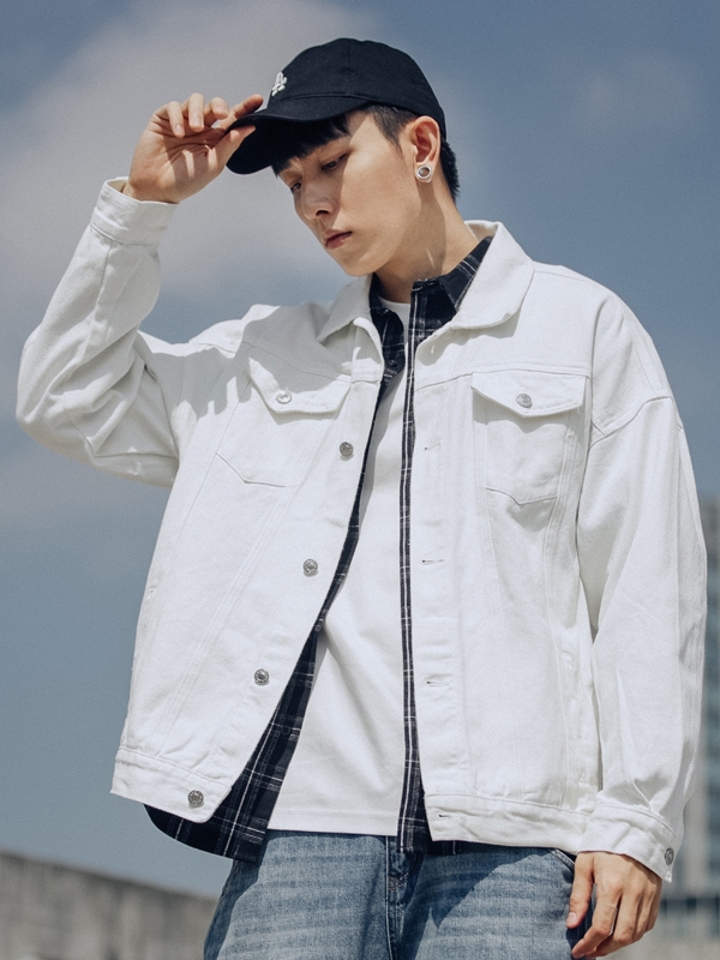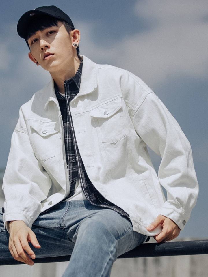 非常简洁的白色牛仔外套,硬朗的廓形,搭配黑色纽扣,时尚又很和谐。帅气的翻领和衣袖上,加入有趣文字,凸显人文气息的同时,也增添了青春活力。