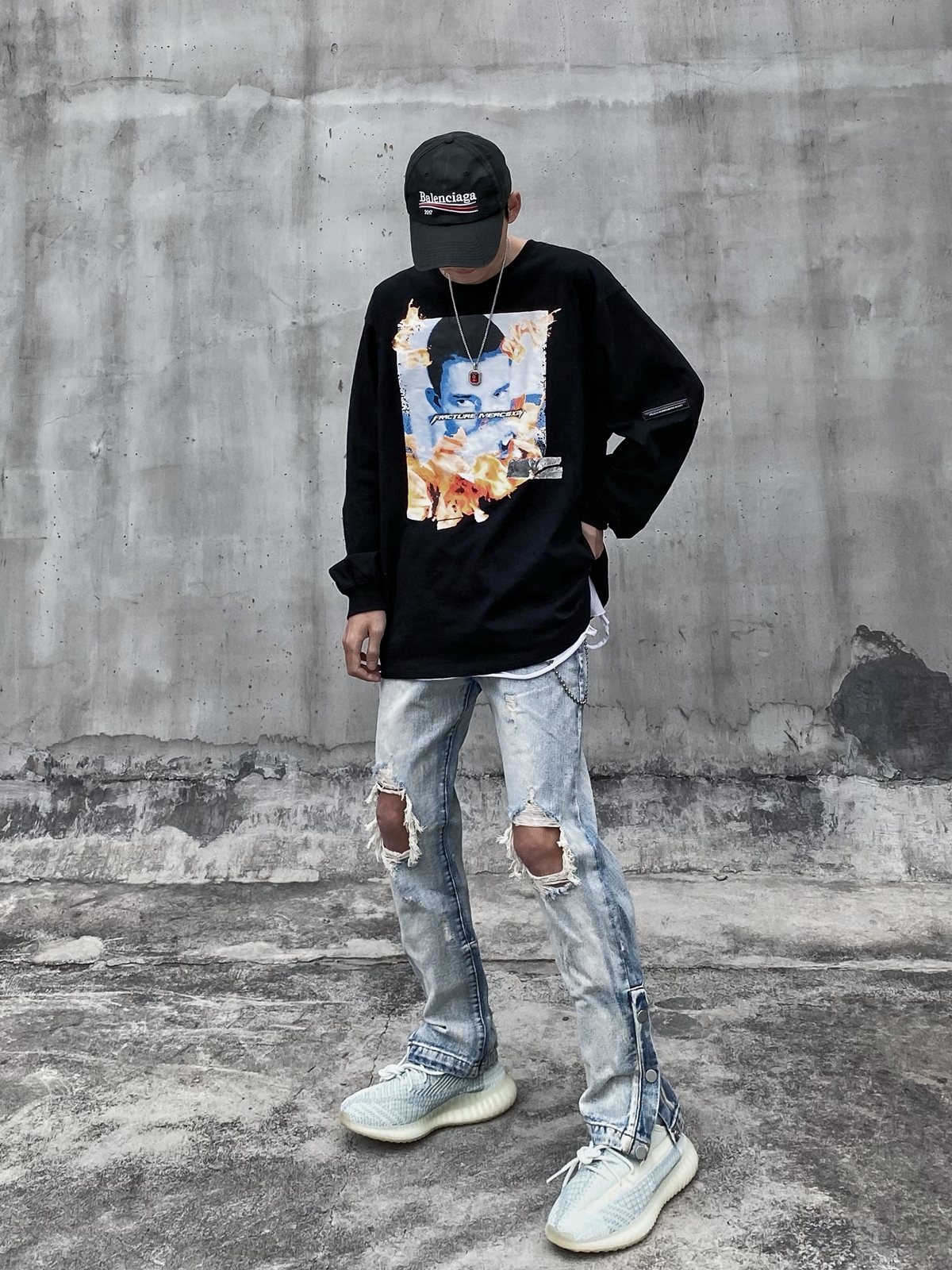采用舒适弹力适中的牛仔棉布料制作,利落的A字廓型剪裁,微喇叭更显休闲以及延展双腿线条。复古排扣高腰设计凸显嬉皮士的个性紧身;而不对称的单边裤管磨破设计则凸显你的不羁。
