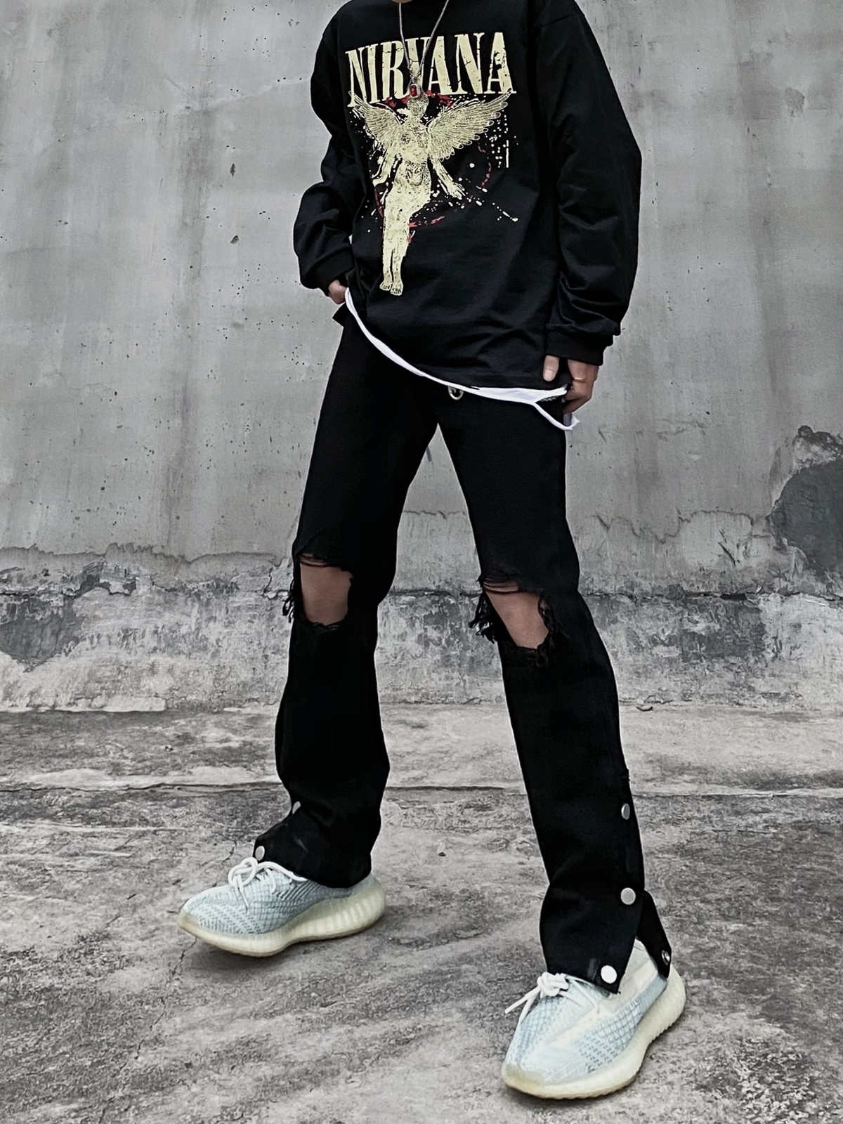 由舒适透气的棉质水洗面料打造的牛仔裤,侧不规则排扣开叉,新颖十足,搭配直筒酷炫,利落有型,拉长腿部线条,解开扣子亦可当成喇叭裤穿,趣味十足。