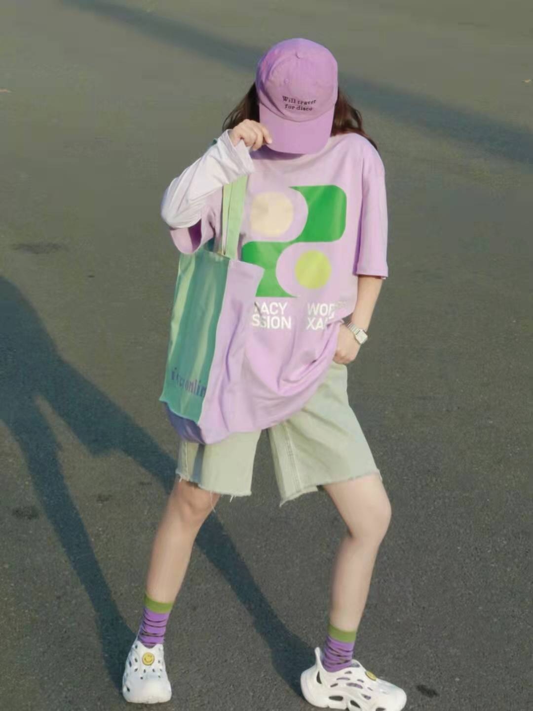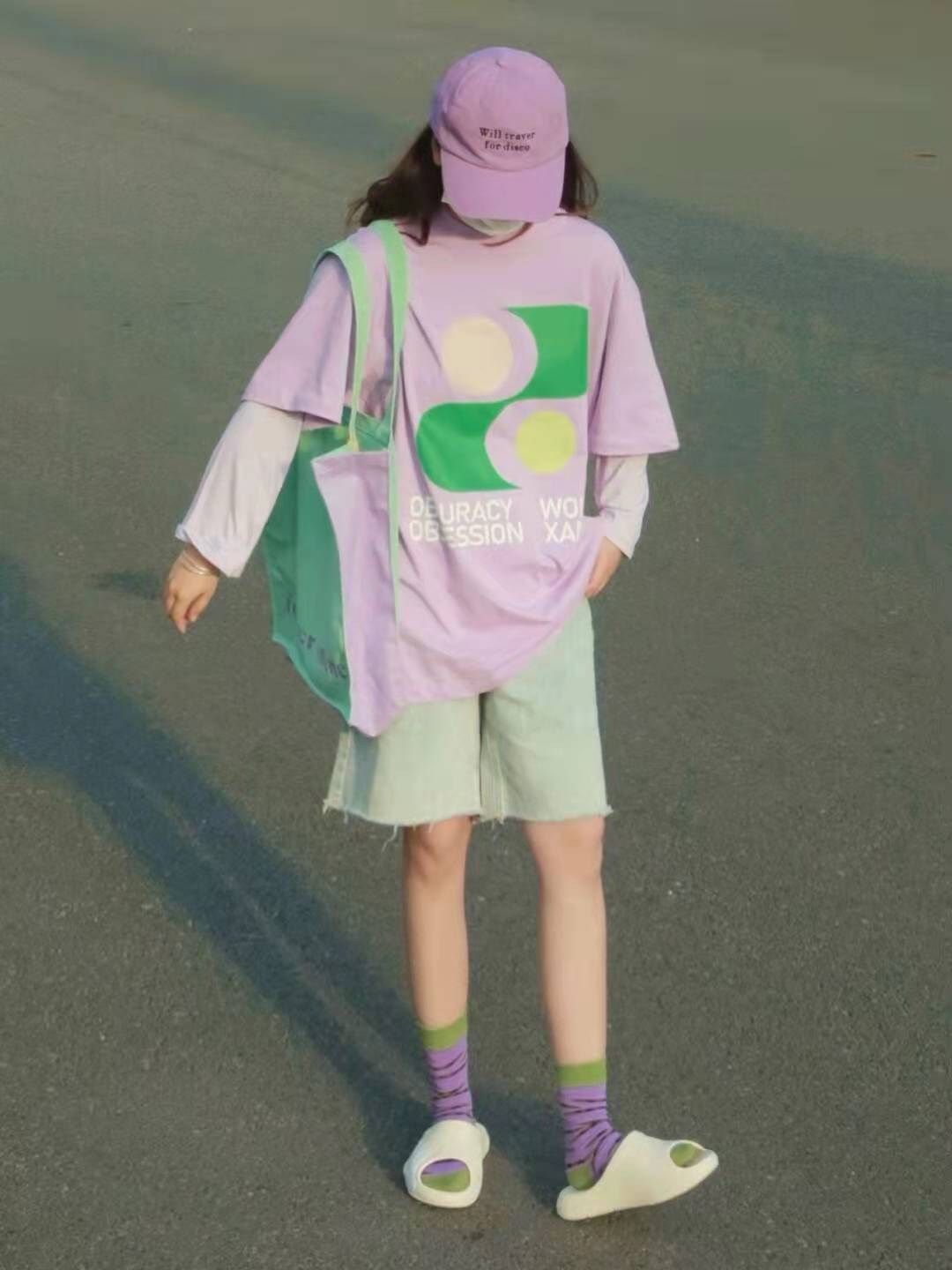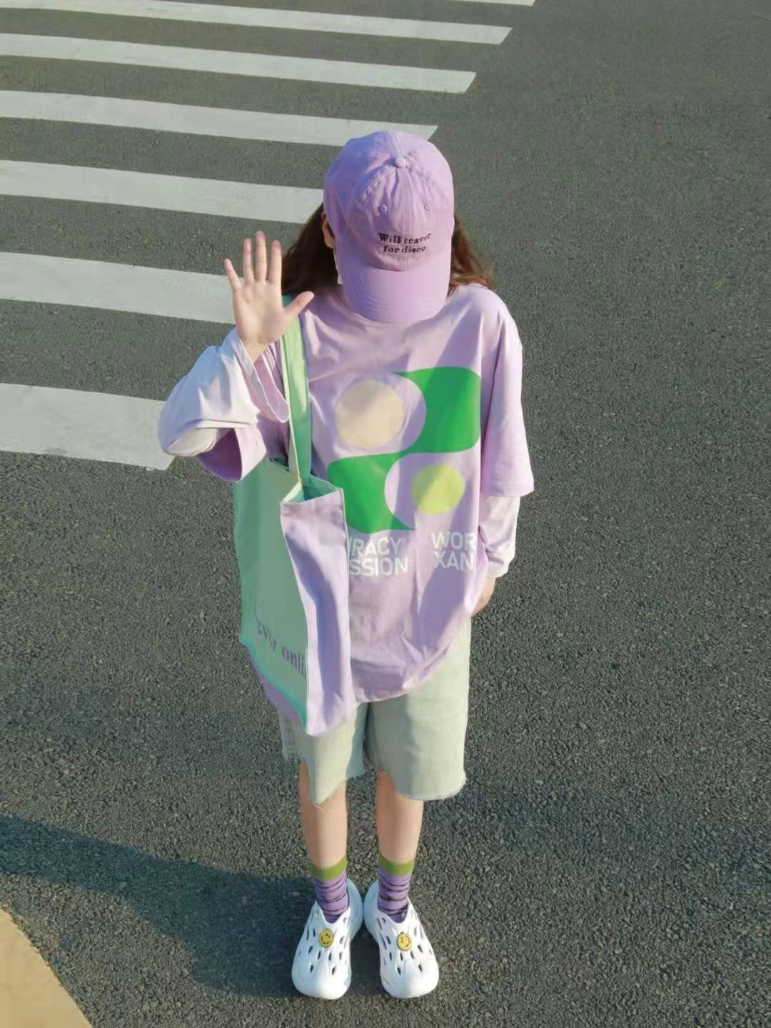 而紫色和绿色的碰撞我发现却意外的好看,,好看又有搭配的层次感,穿搭上的小心机总能给人眼前一亮的感觉,且极度舒适。