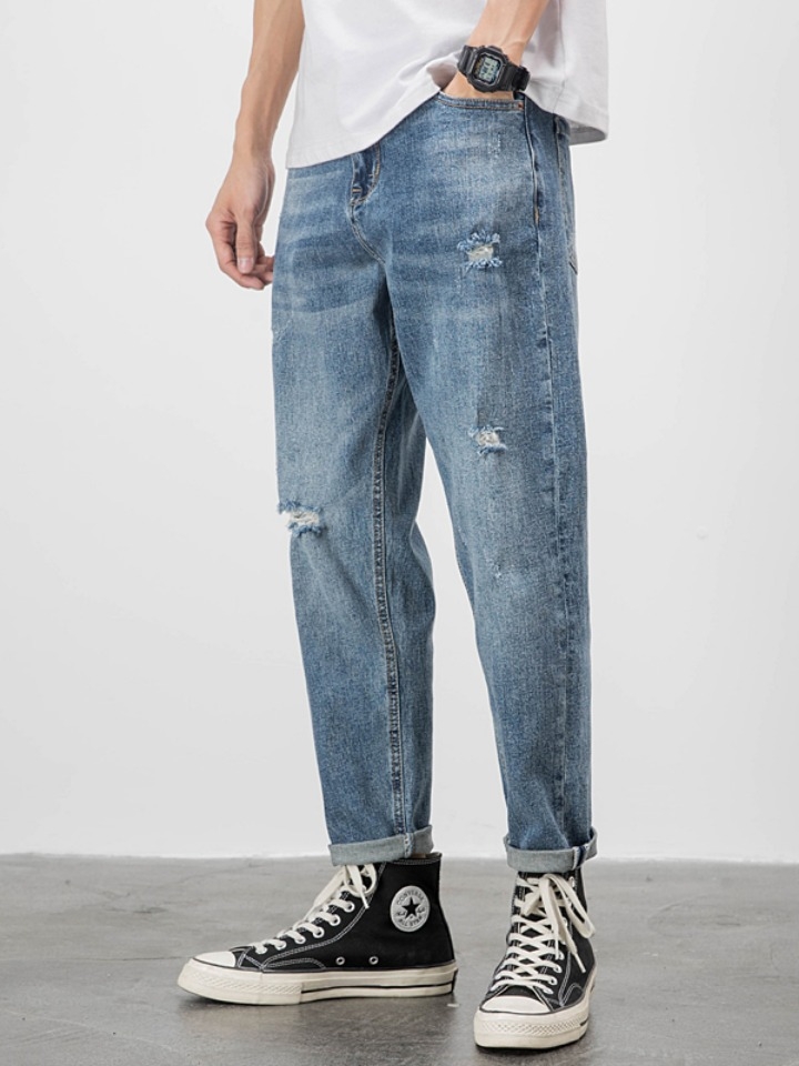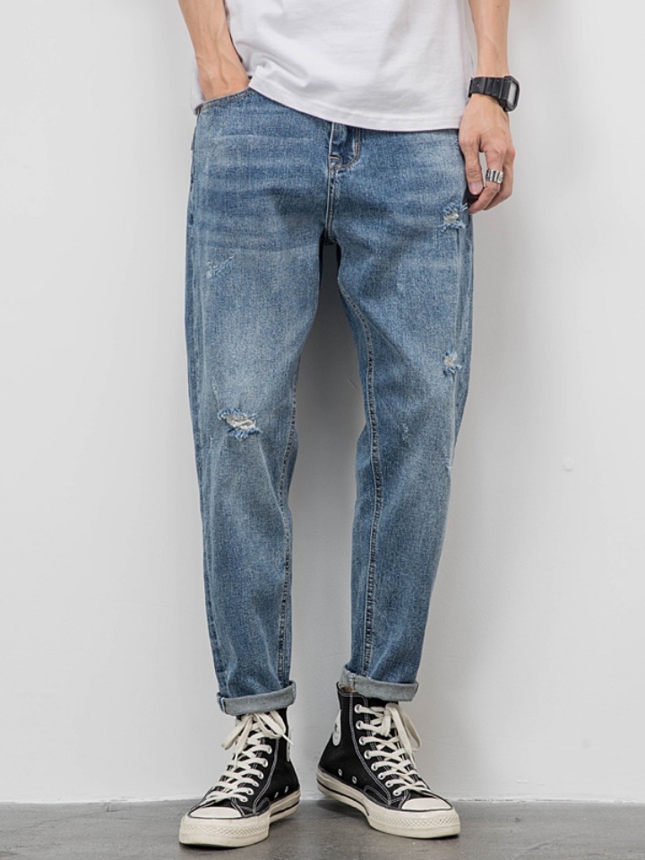 浅色破洞直筒牛仔裤,简易浅色元素,彰显青春活力,展现俏皮,膝盖破洞的剪裁,凸显个性,增添设计感,街头风十足。