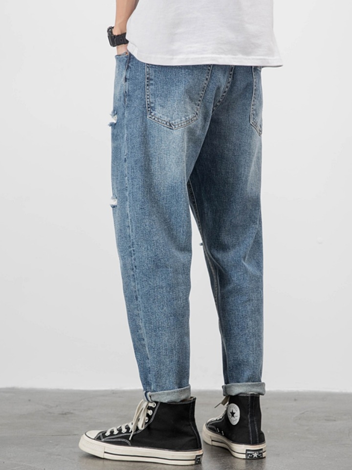 轻复古的水洗牛仔面料让穿搭更休闲与洒脱。裤型是宽松的阔腿版型,不局限身材同时还能够任性的搭配,破洞设计搭配九分,潮流不言而喻,可以搭配当下十足火热的渔网袜,打造高街模式。