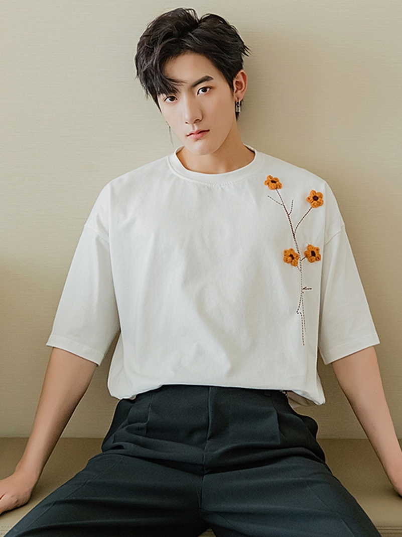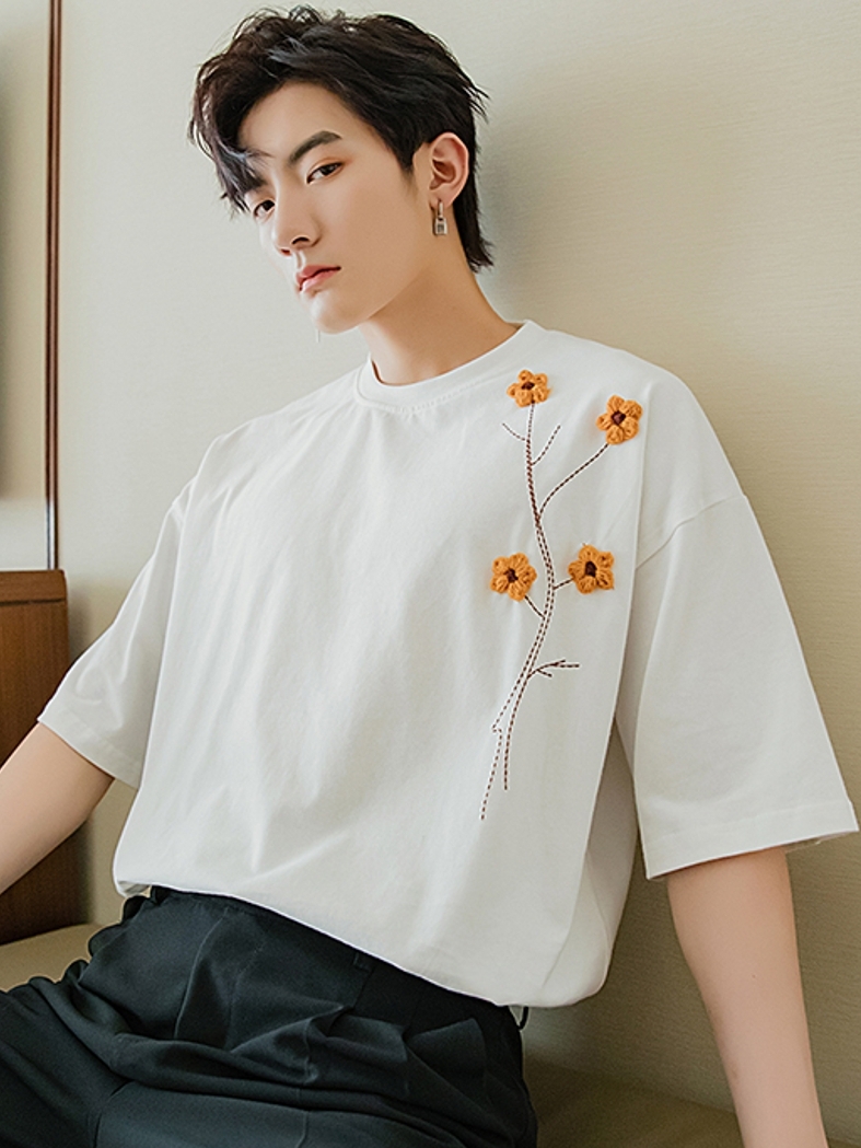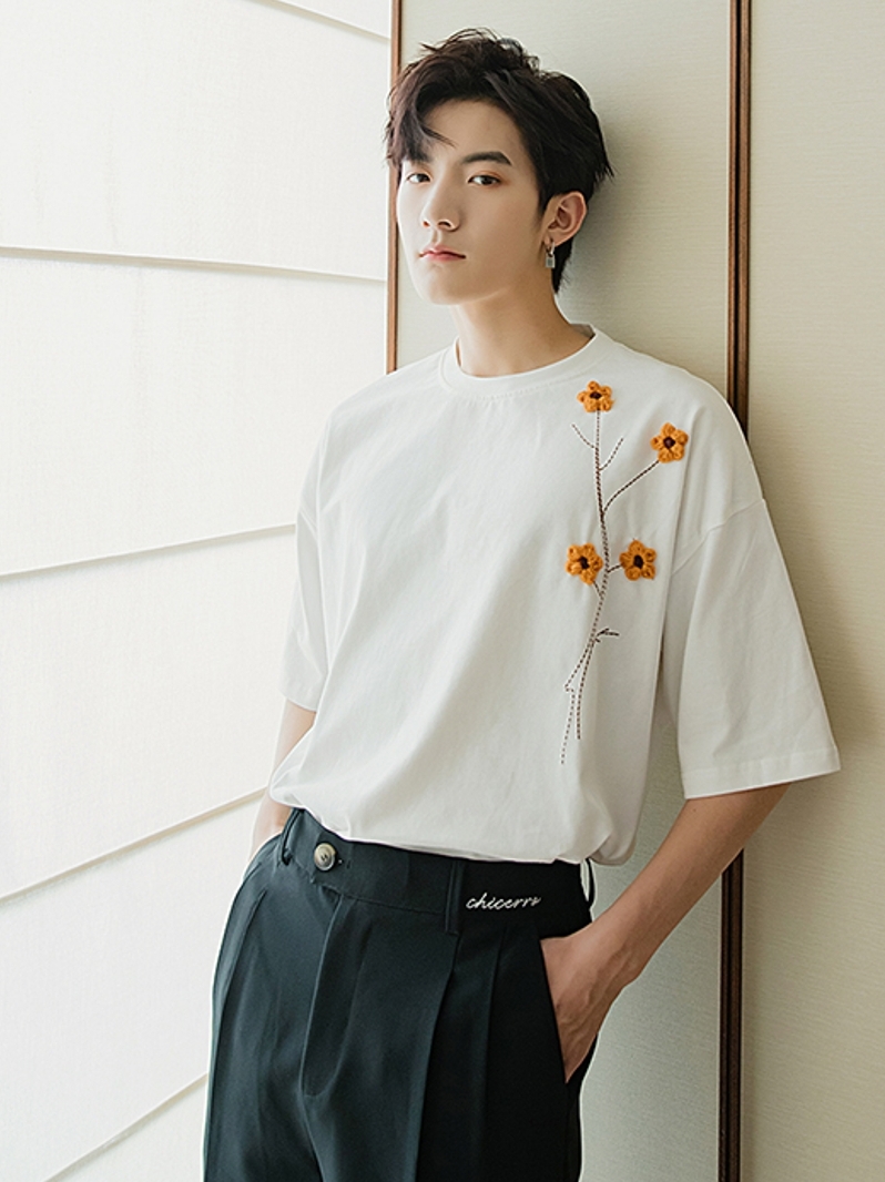 衣服挺有设计感的,在胸前的位置做了一个毛织桃花和刺绣线迹的树枝设计,让原本挺普通的一件白T恤变得格外好看。