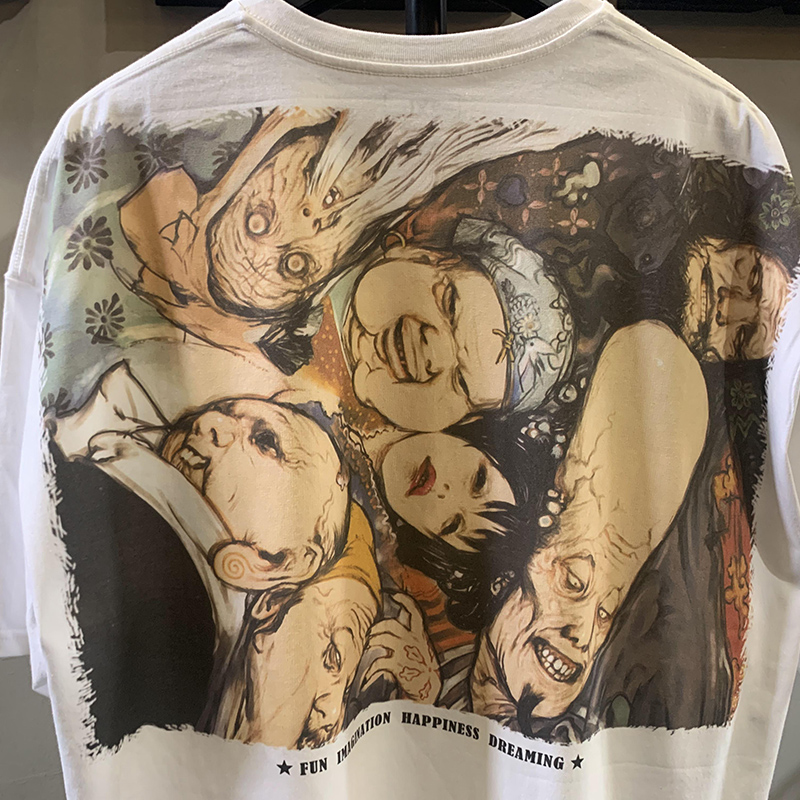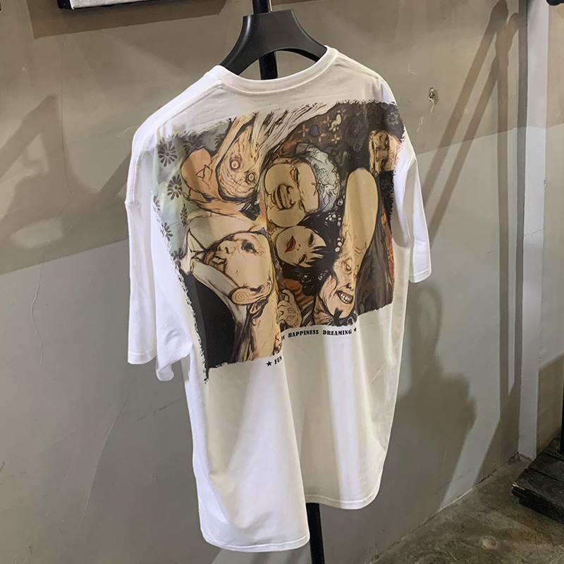 创意十足的一款短袖t恤,时尚的印花设计,充满了趣味性,宽松的版型,穿着舒适自在,休闲的圆领,修饰颈部线条,纯棉面料,亲肤透气。