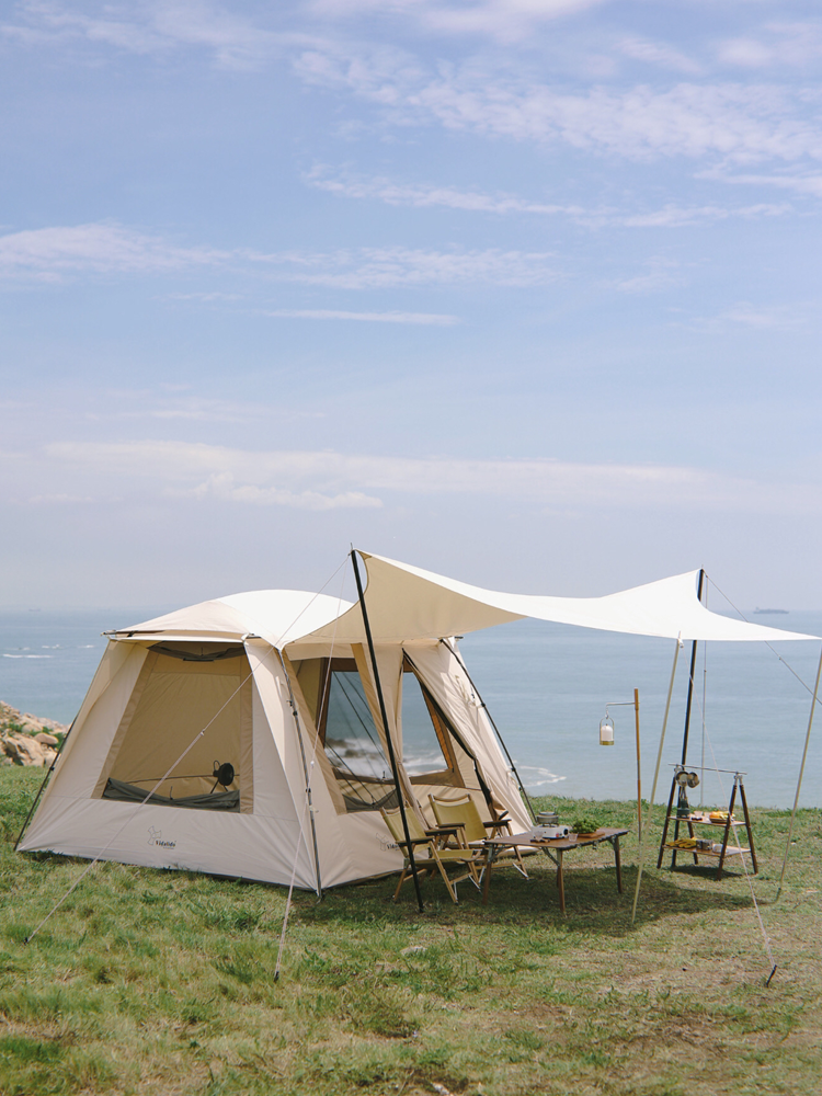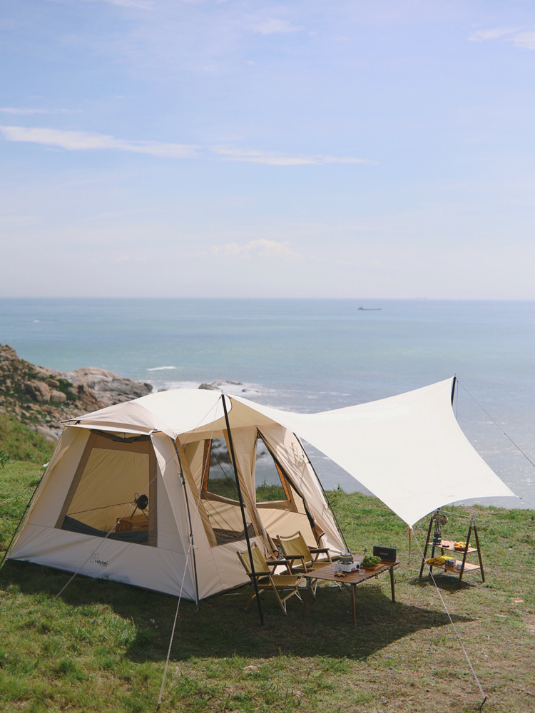 双层全封闭的帐篷落地式的设计,您可在露营期间将四周闭合,有效保护账内不被雨水侵入,帐篷的顶部透气窗、两侧与两扇门总计5个开口,夏日即打开全部开口享受清爽凉风。