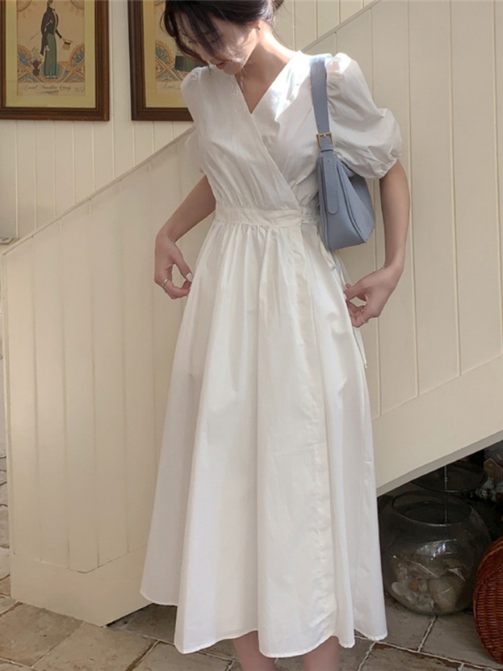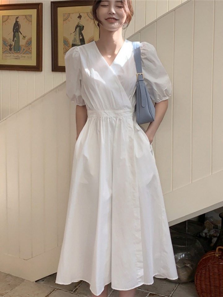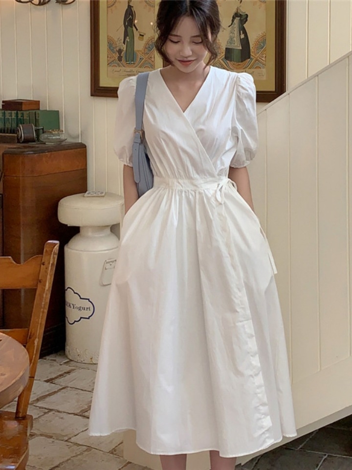精致的V领设计,不加配饰就十分的有女人味,要是加上配饰,则时髦洋气。收腰的版型,勾勒身材的没搞。白色高贵优雅,才是打造复古feel的利器。