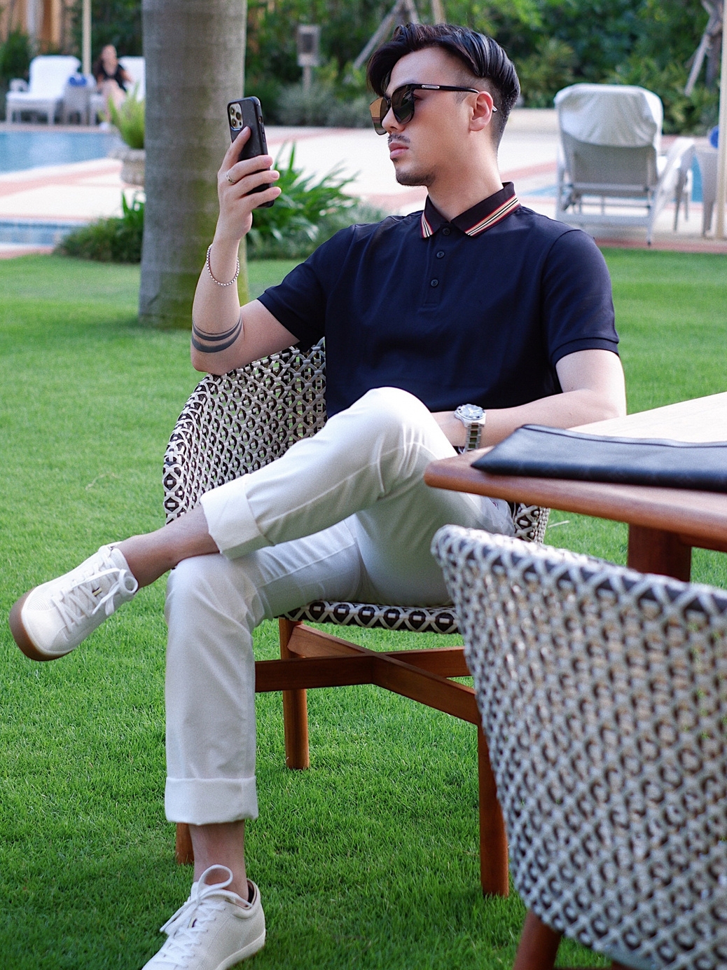圆领的短袖上衣,搭配宽松的版型与印花款式,使得衣服风格休闲又百搭。因此,下半身可以穿着配套的松紧腰短裤,增加穿着的舒适度。头上佩戴一顶遮阳帽,有效防止夏季日照的强烈照射。如果天气炎热还可在外面套一件防晒服防止晒伤。