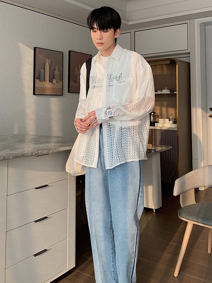 很是清爽的镂空衬衫,小个子的哥哥可以搭配牛仔裤穿着,也会别有一番风情~上身就穿出浓浓的青春气质,又不会过于张扬。