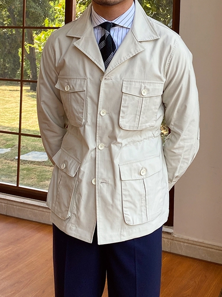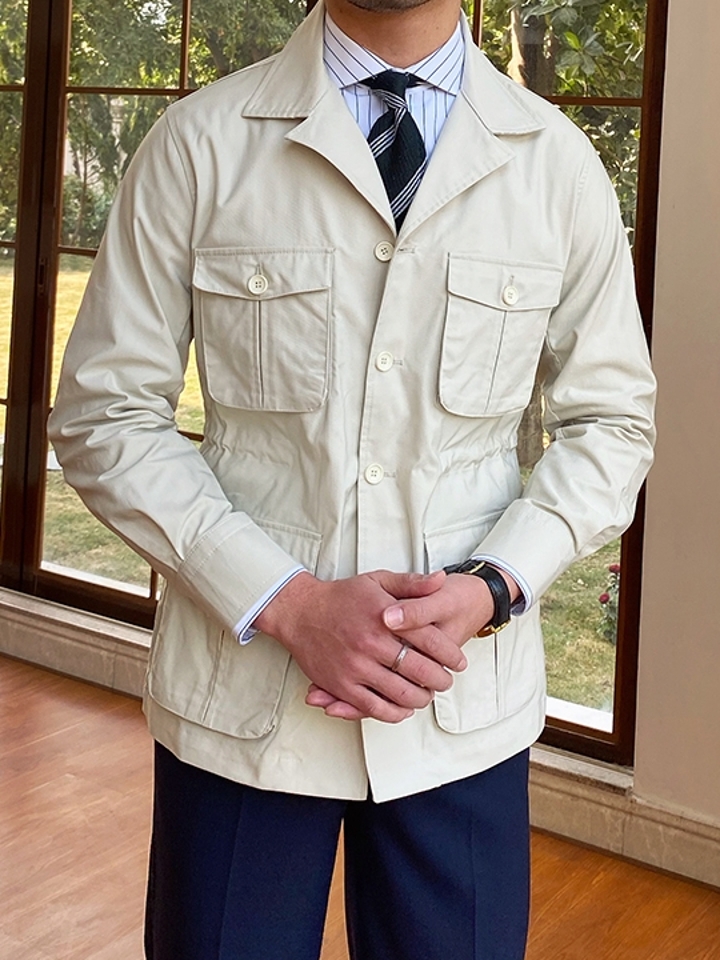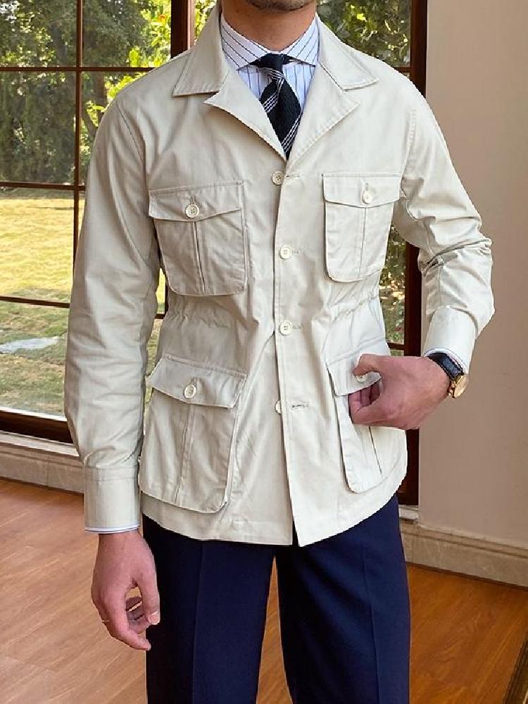 烘托出几分沉稳大气的腔调,丰富了整体的层次感之余,设计师选用经典的翻领剪裁,勾勒出男士硬朗的脸部轮廓,配以方形口袋的拼接,嵌入纽扣的装饰营造出一种复古英伦的氛围,这款工装夹克外套充满简约大气的格调。