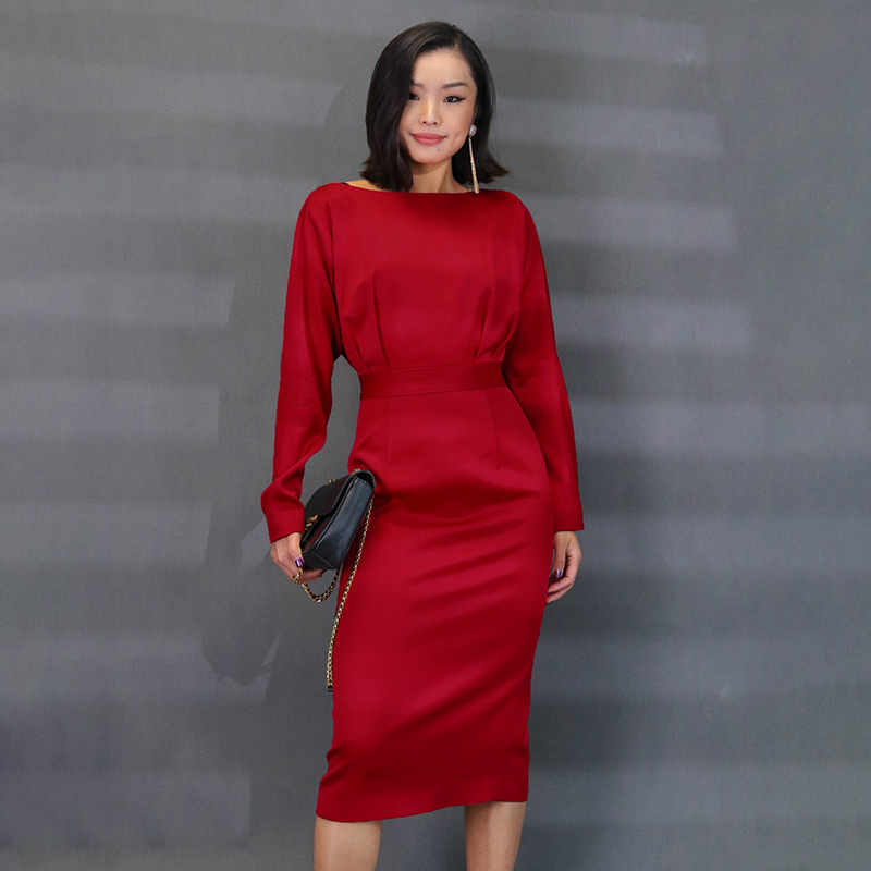 红三种颜色,经典不过时,修身版型,展现曼妙身姿,礼服版型,修饰身材曲线,中长款连衣裙,修身显瘦,气质V领,修饰脖颈曲线。