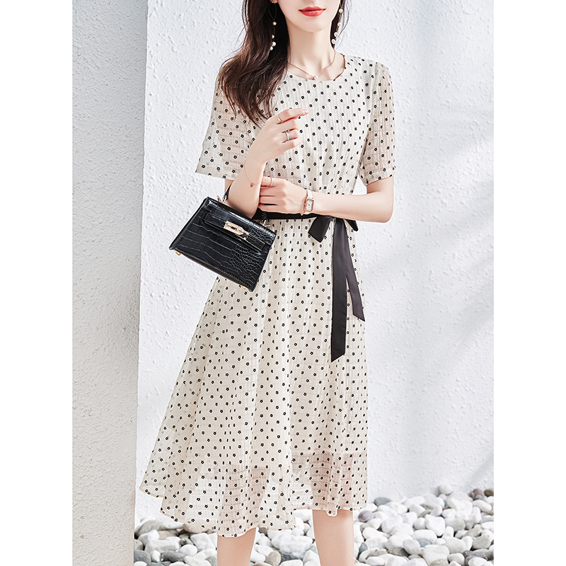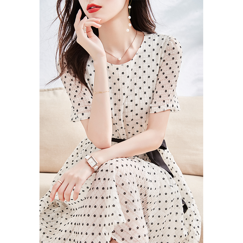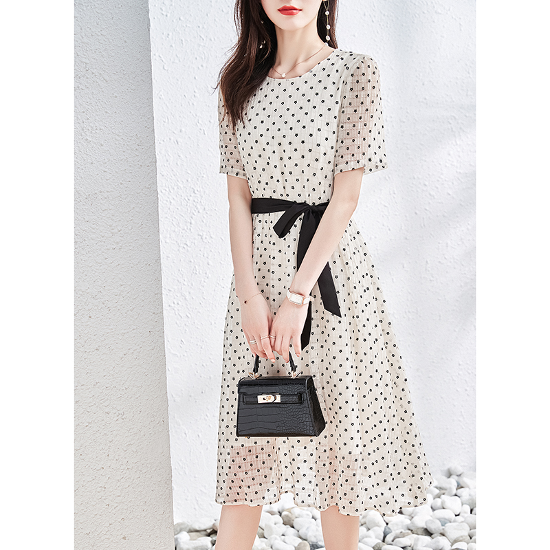 收腰设计,凸显纤细腰身,裙子的设计,非常的百搭,中长款连衣裙,修身显瘦,白色的色调,简约又大方,中长款的版型,修饰身材。