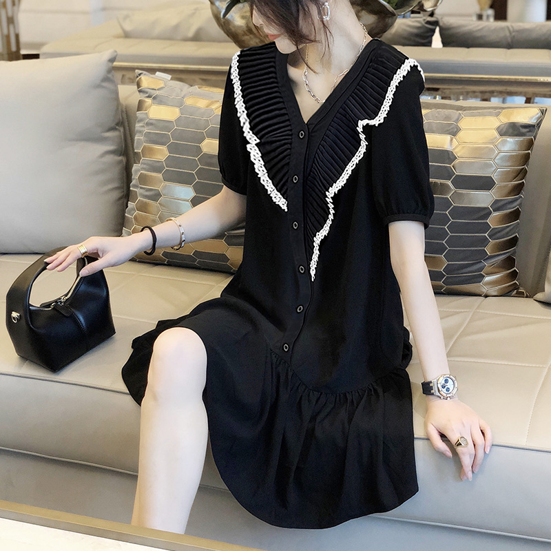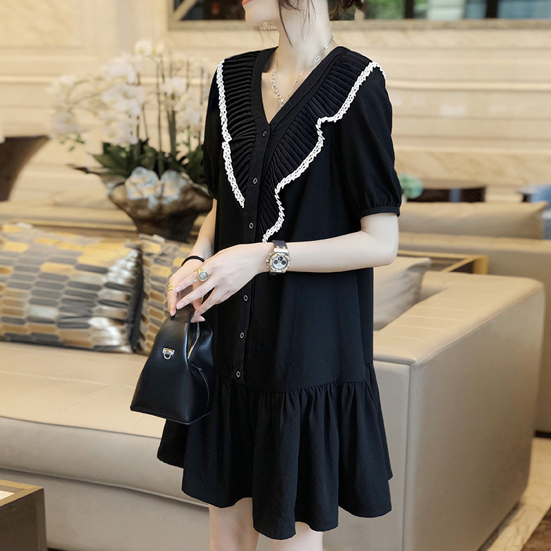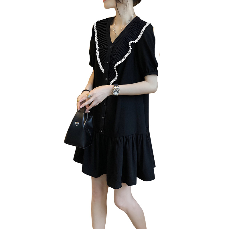 连衣裙是复古的风格,领口的设计,很有气质,收腰的版型,显瘦又显高,非常的显气质。