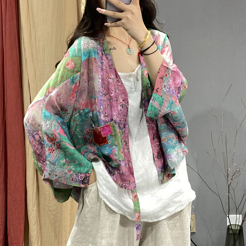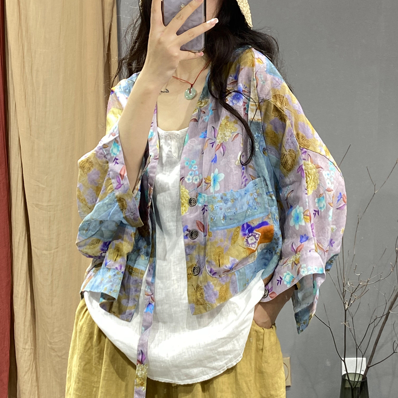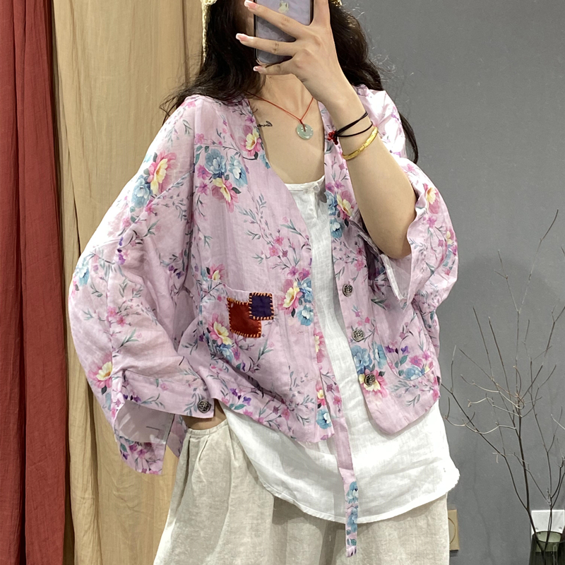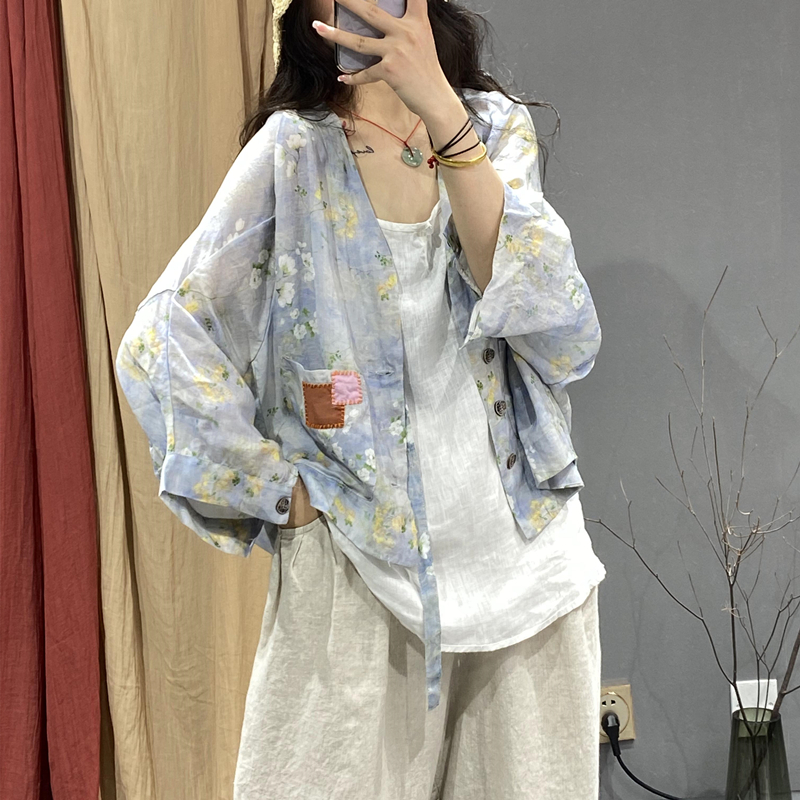 棉麻材质,穿着舒适透气,复古印花,彰显时尚韵味,衬衣版型,修饰身材曲线,宽松版型,穿着舒适自在。
