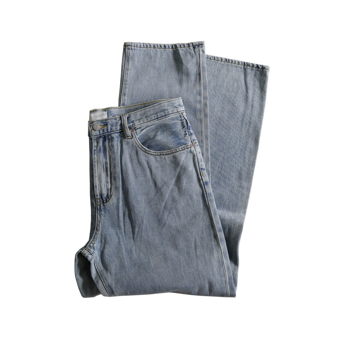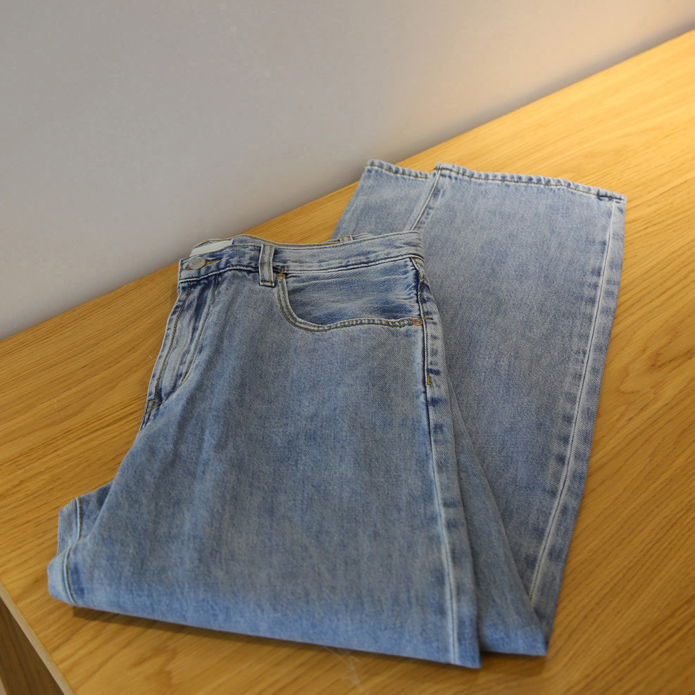 高腰设计,拉长身材比例。高腰牛仔裤,显瘦显腿长。直筒裤型,修饰腿部线条。