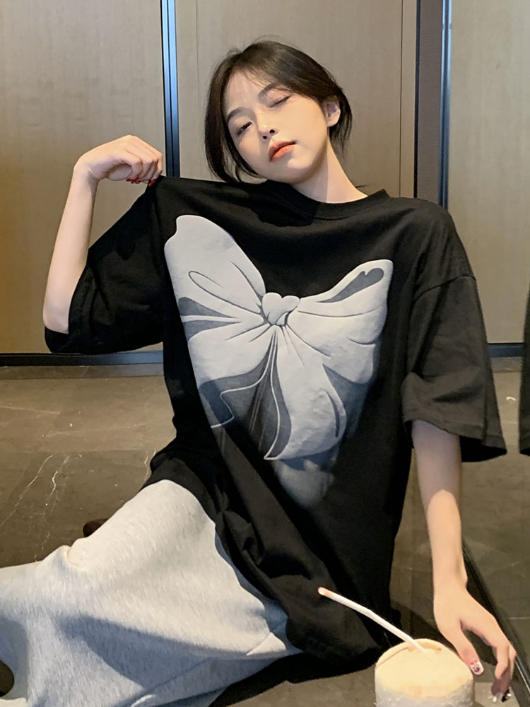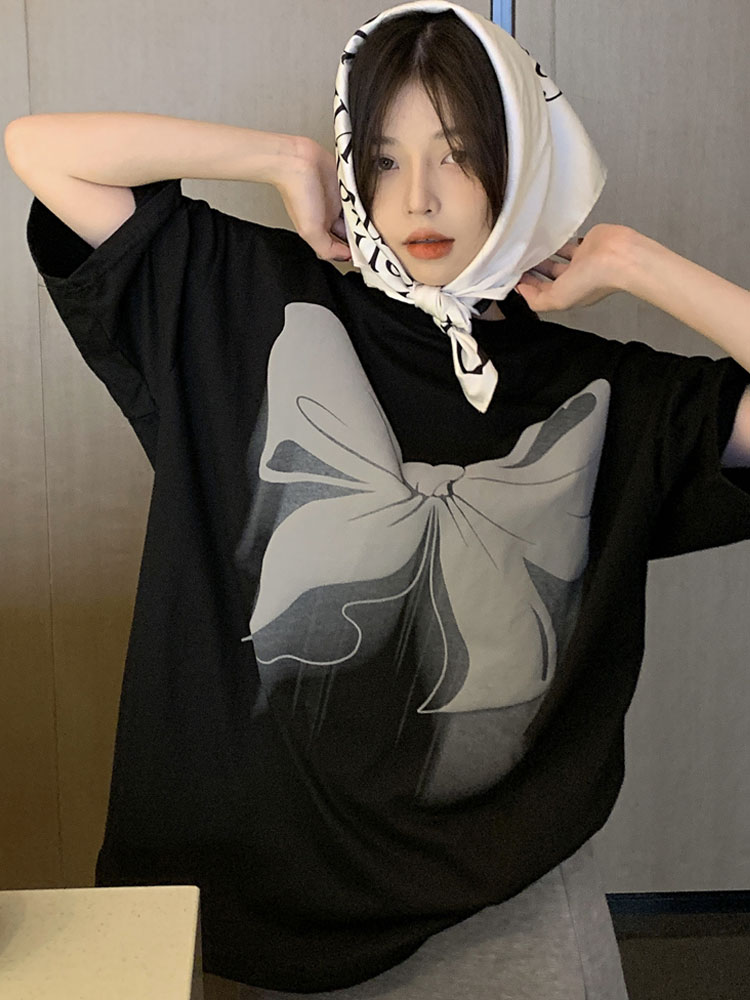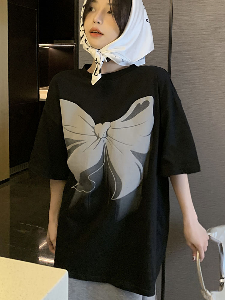 这件T恤衫呈基础款直筒版型,将上半身的线条勾勒的十分流畅清晰。黑色的主色调与醒目的蝴蝶结印花碰撞出炫酷且惊艳的火花。