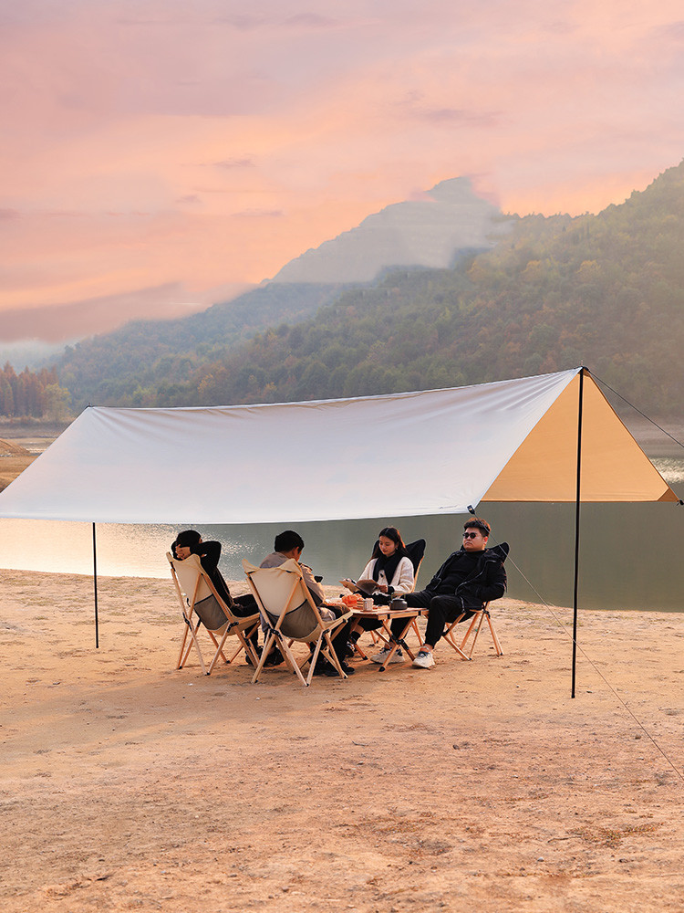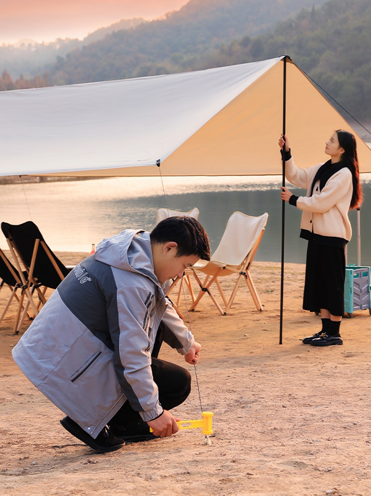 这款天幕帐篷采用优质涤纶面料,结实耐磨,有效防水抗撕裂;边角多重加固打枣织法,经久耐用,承重性好;反面角部双层面料,扩展性好,轻松应对户外恶劣天气。