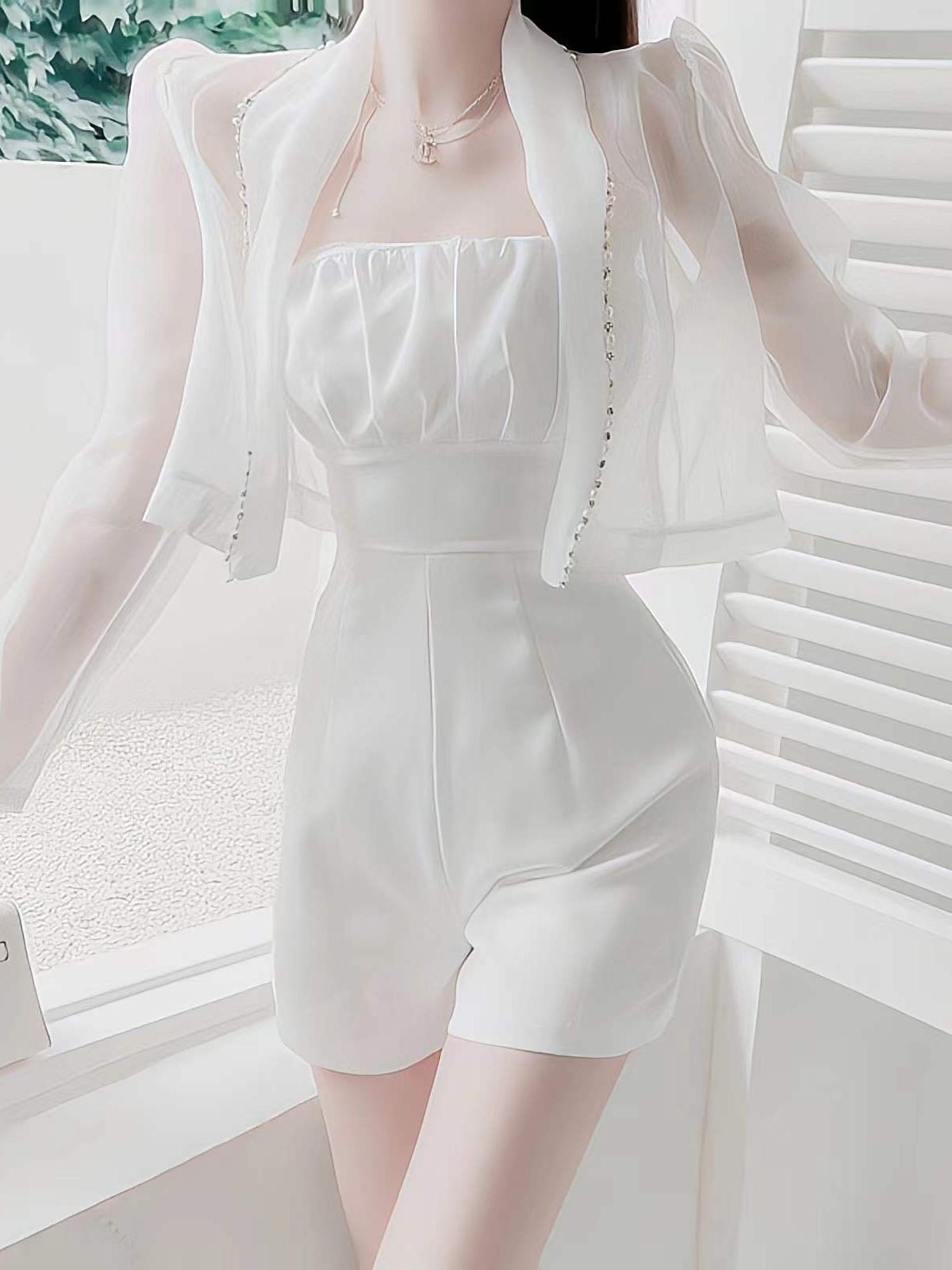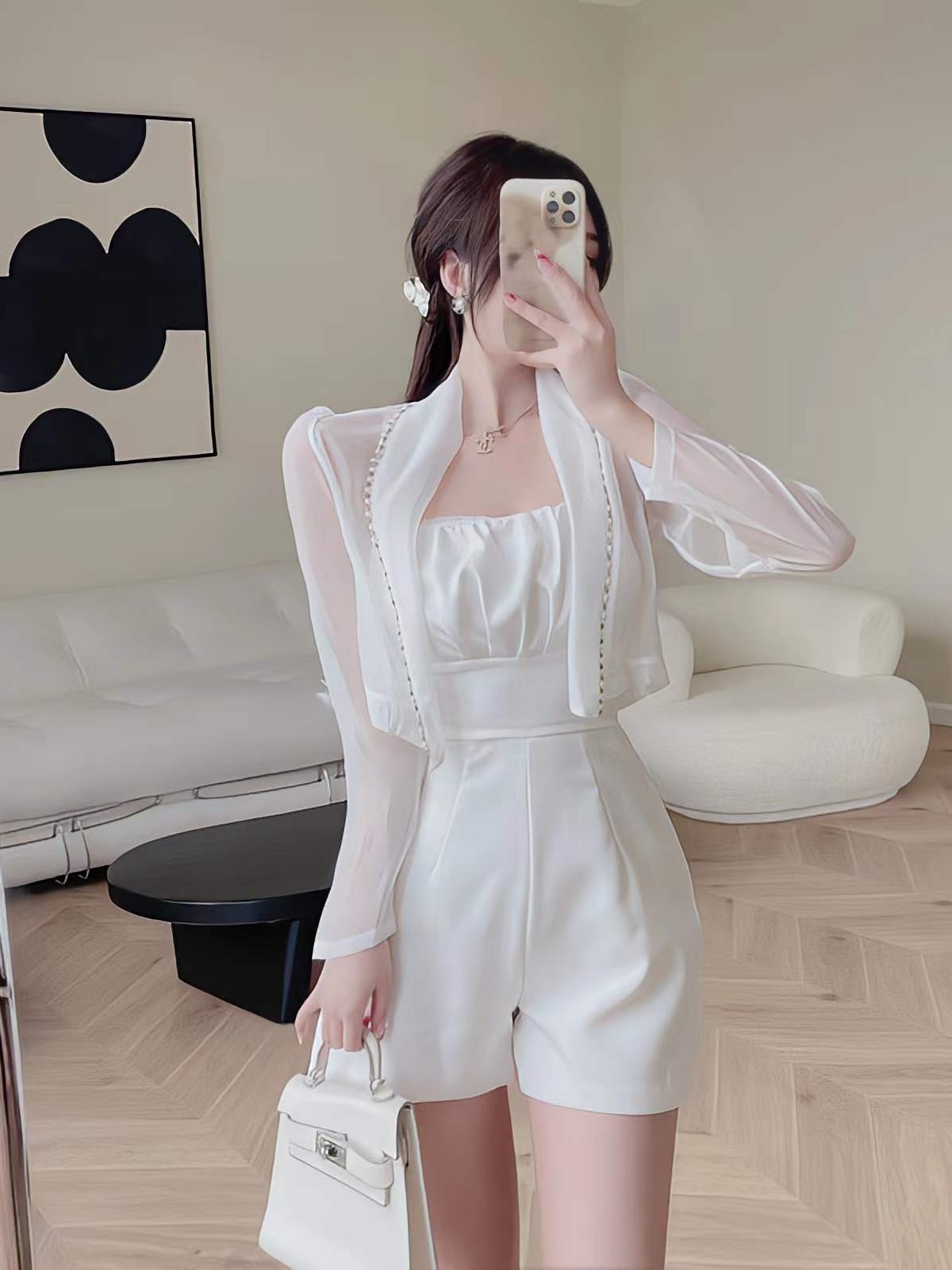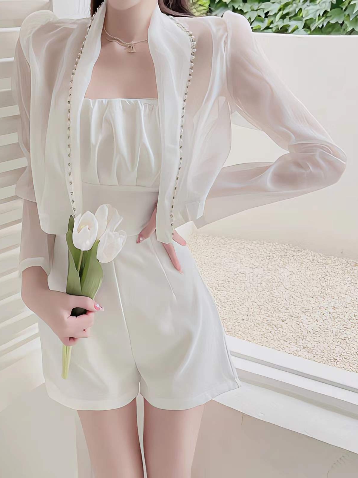夏季火辣辣的太阳,出门要准备一件防晒衫,纯白色就自带不少的仙气,珍珠和水钻装饰洋气又减龄。