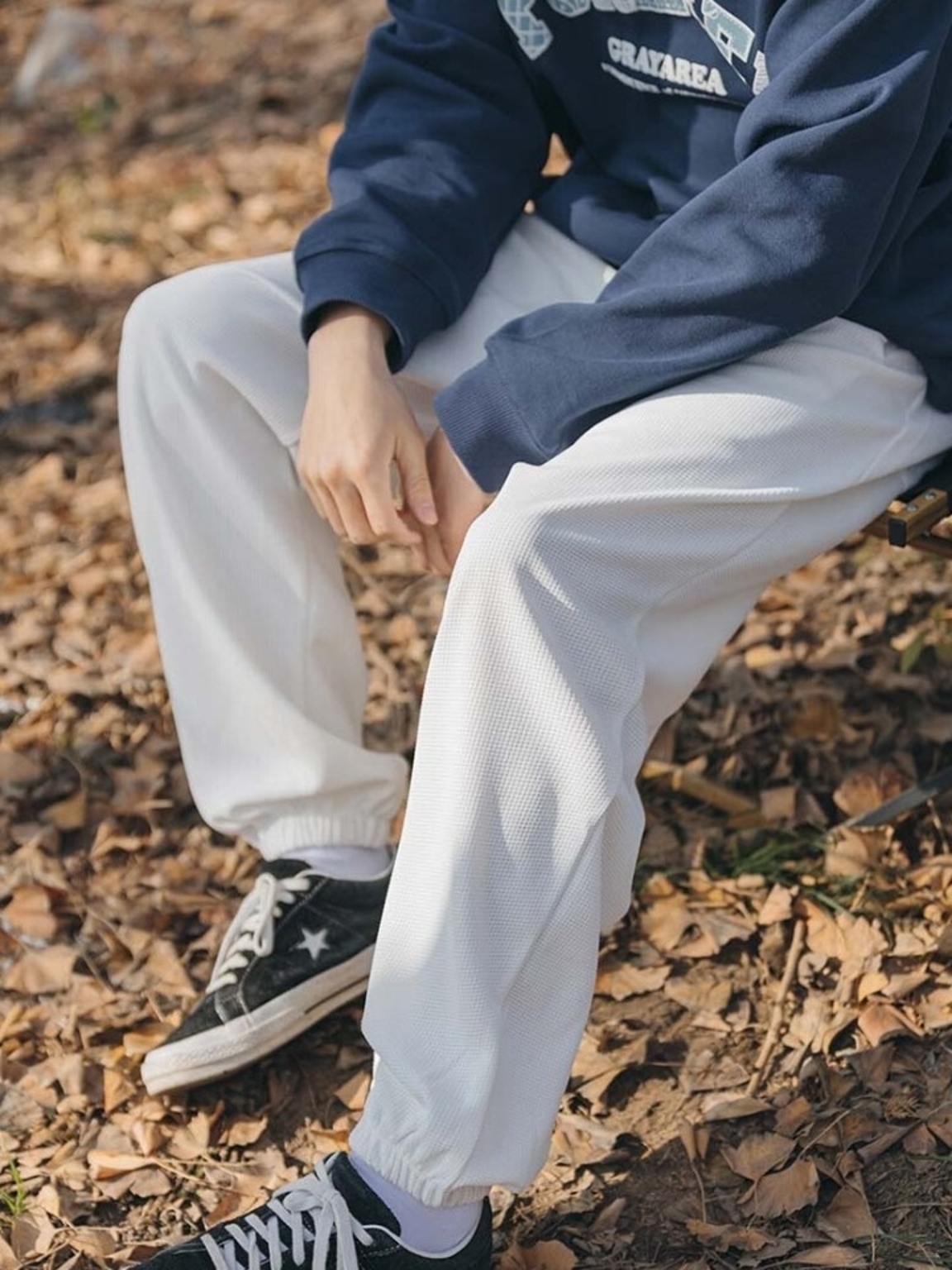 华夫格面料的一款运动卫裤,束脚的小心机设计,别出心裁,修饰腿型。腰部松紧系带设计,穿着舒适,极具包容性,对任何身材都很友好。