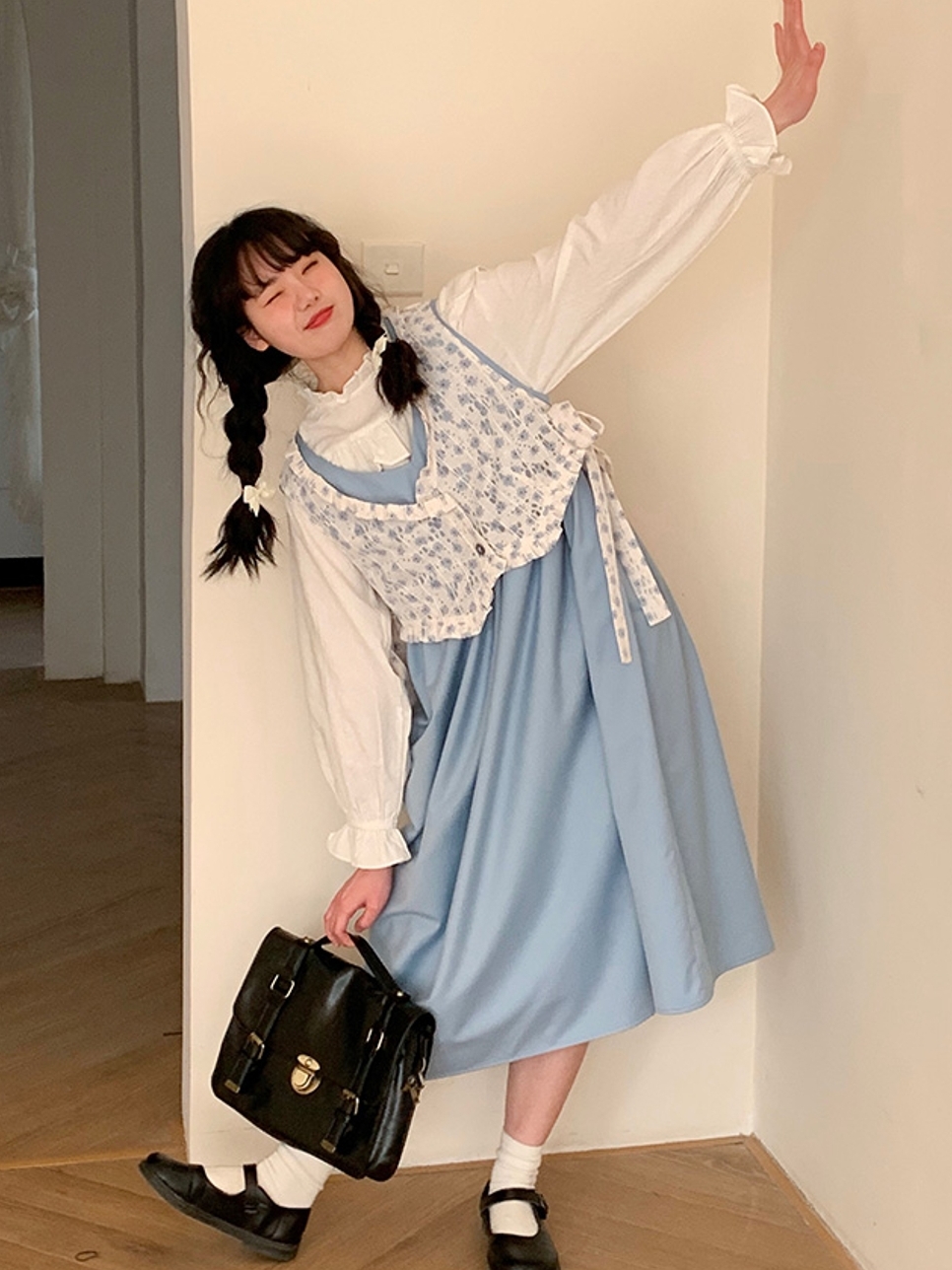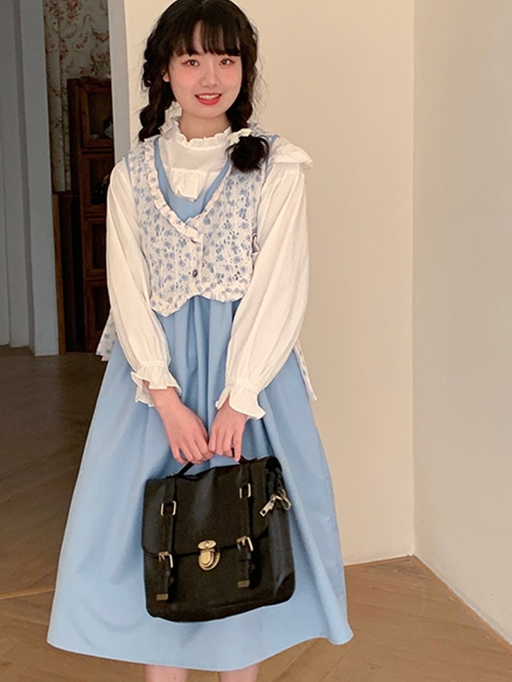 看似简约的连衣裙,在上身后满满的气质范儿,而在搭配着简单的内搭和小皮鞋时,一下就演绎出了学院风的少女韵味呢。