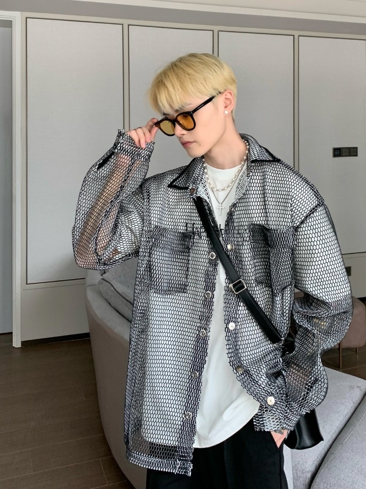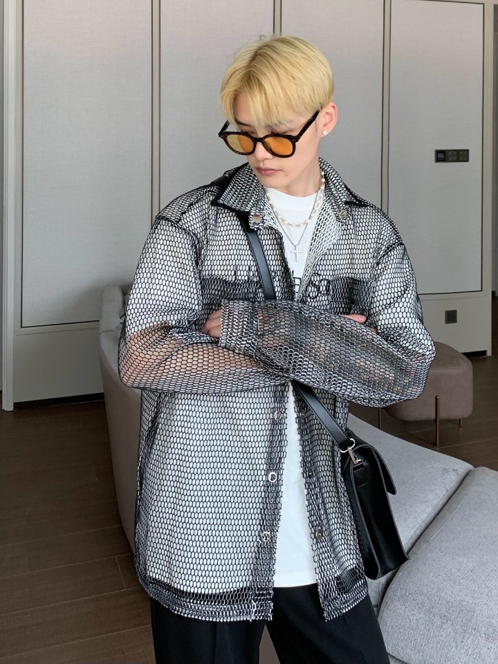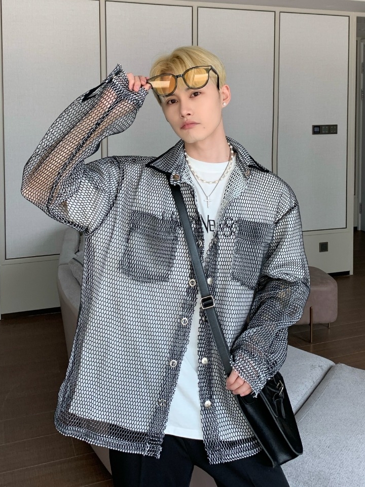 这款衬衫全身镂空给衣服增添时尚创意感,短款的版型视觉有显高的效果哦,内里搭配一款白T恤和黑色的休闲裤,超级的有范儿。
