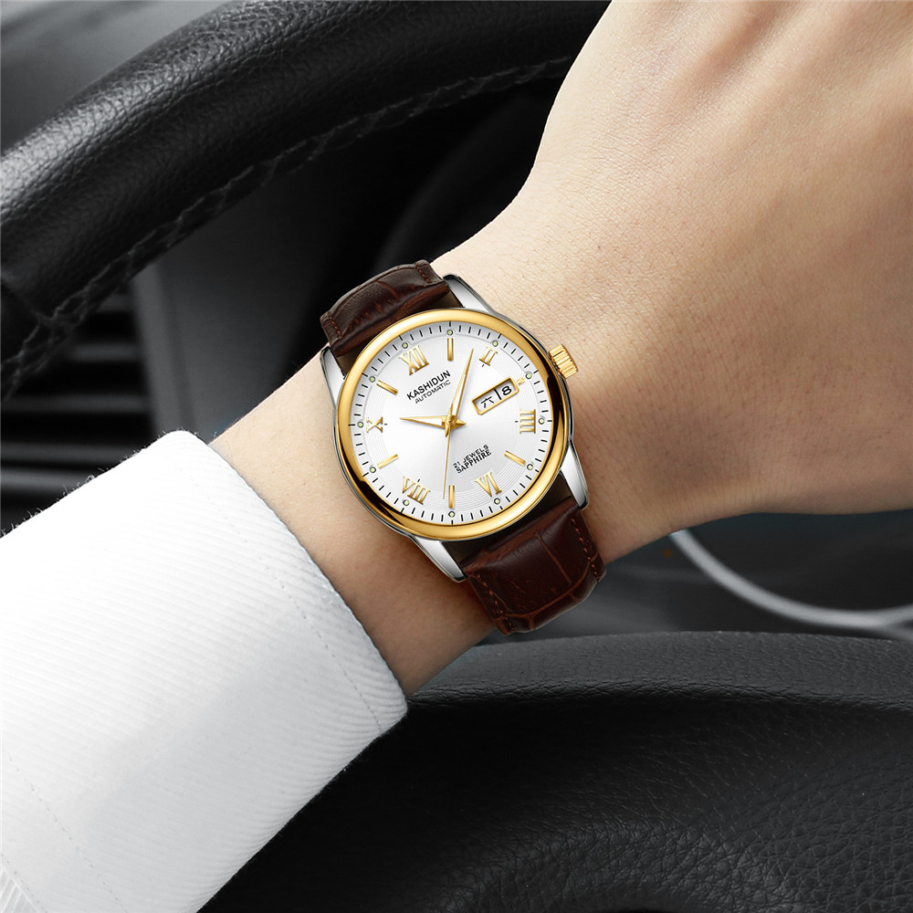 这是一款时尚简约的机械表,表盘采用人工合成蓝宝石镜面材质,坚固耐磨防刮。