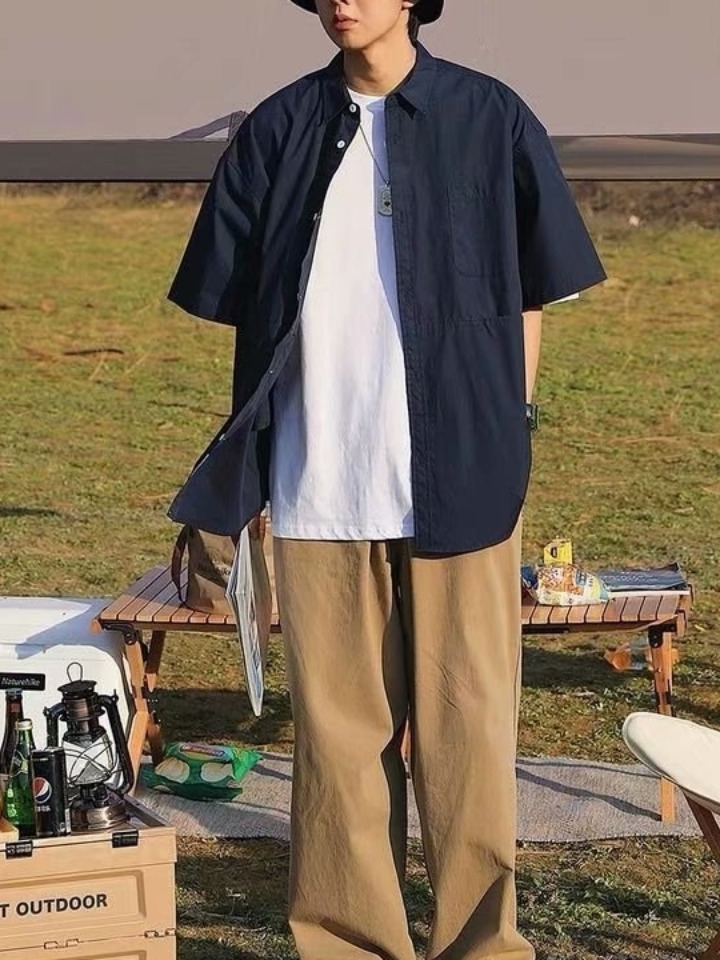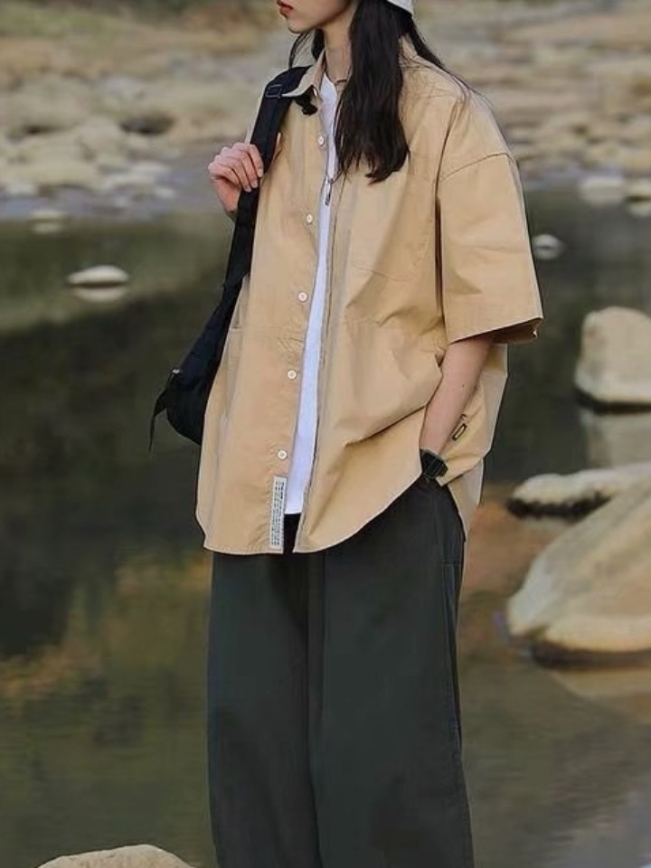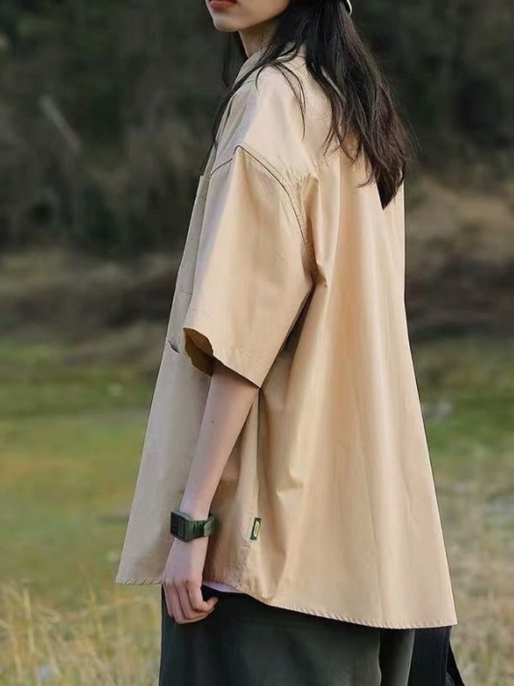 很休闲的长袖衬衣,有点像薄夹克,胸前两个口袋拼接,看起来更有工装风,面料是棉和氨纶混纺的质地,亲肤柔软。