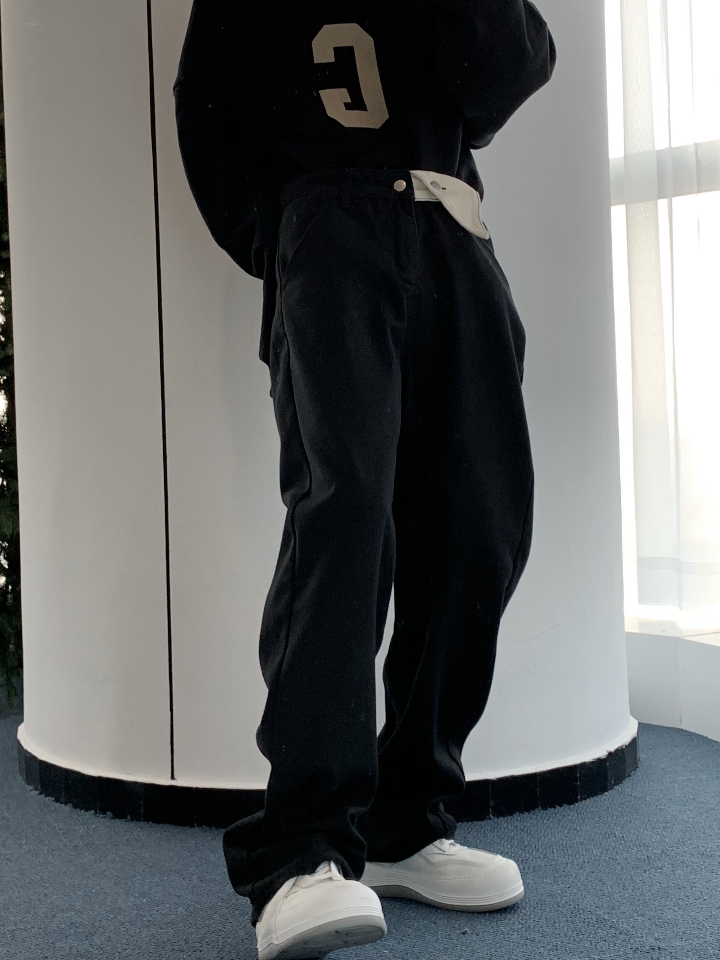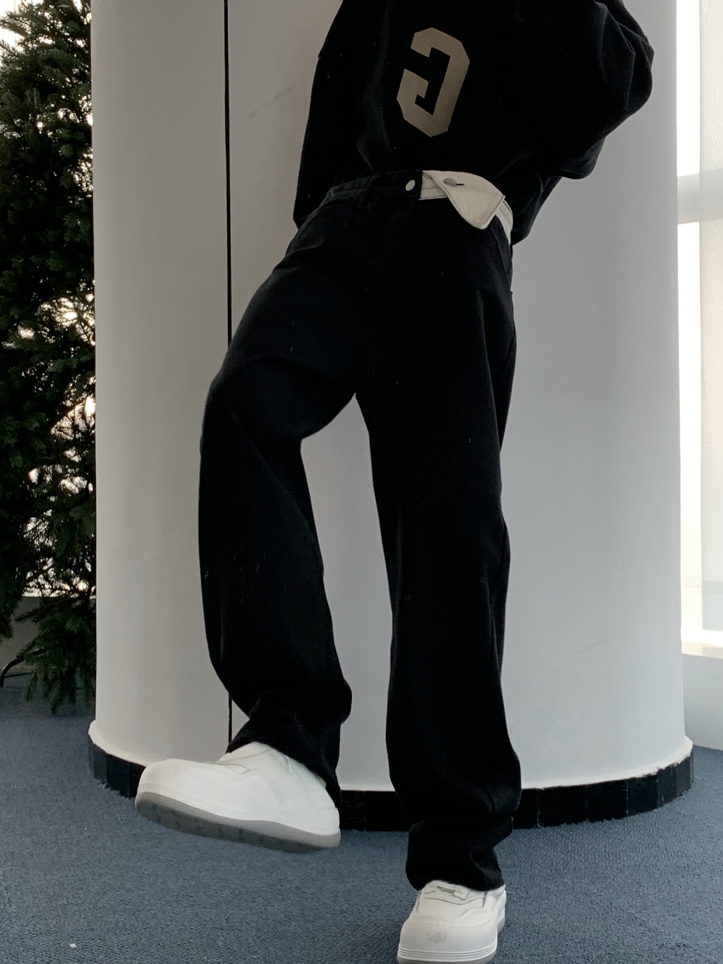 对于这张时尚百搭的黑色系裤子,我偏爱这样的搭配,上身穿一件同色系的卫衣,将暗黑风格进行到底,脚上再来一双小白鞋,不失青春的气息。